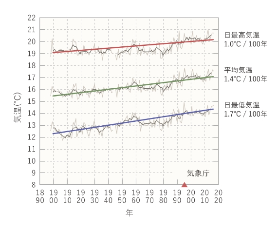 兵庫県の代表的な観測地点である神戸でも、平均気温、最高気温、最低気温は年々上昇しています。