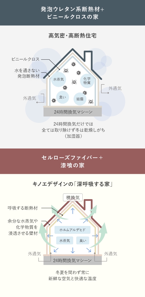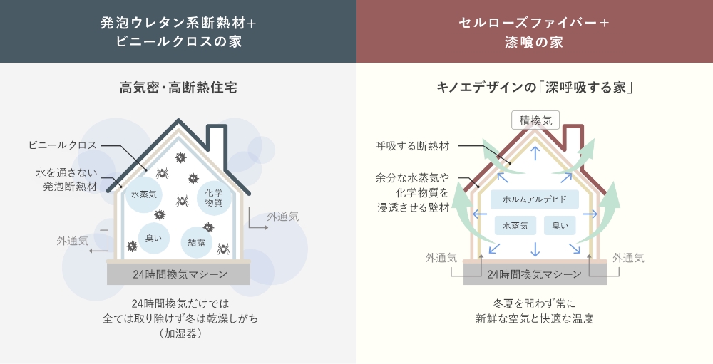 だからこそ、大切なのは化学物質を家の中に溜めないこと。高気密・高断熱のみの住宅の場合、換気扇で強制的に換気を行いますが、それだけでは十分とは言えません。どうしても家の中に淀んだ空気が留まってしまいます。