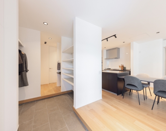玄関からは土間収納とパントリーを抜けてキッチンに続く動線と、玄関ホールからリビングに続く2つの動線を確保。