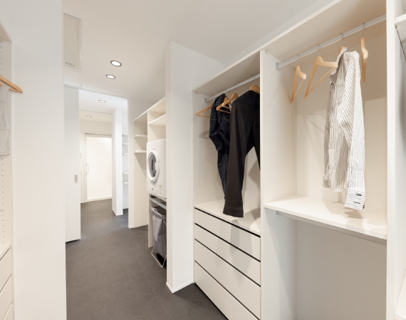 広々とした部屋干し可能なランドリールームからファミリークロークが一直線でつながっているため、お洗濯の“洗う・干す・片付ける”の一連の流れがコンパクトな動線で完結。