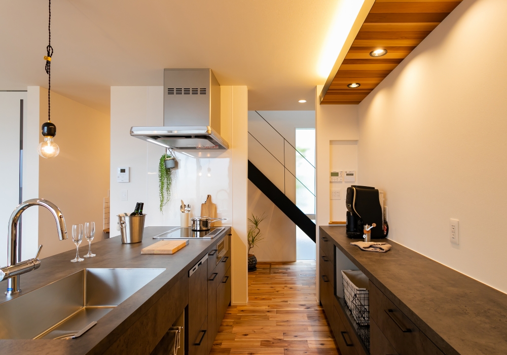 キッチンは圧迫感が少なく回遊できるアイランドキッチンを採用。ダイニングを横並びに配置することで、調理・配膳・片付けの動線が短くなり、キッチンと食卓を行き来する動作が減り家事効率がUP。