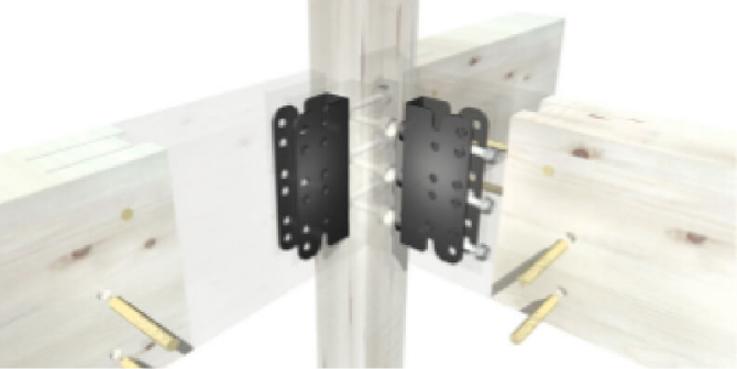 キノエデザインでは、通し柱をはじめ、構造の重要部分に「ドリフトピン」と呼ばれる金物で接合する工法を独自に採用しています。