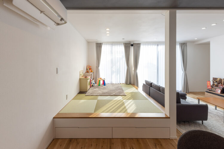 家事効率と収納量の確保を両立した施工事例です。洗う・干す・しまうを一カ所で行えるランドリールームや、おもちゃやアウトドア用品などをまとめてしまえる土間収納があり、すっきりと片付けられる住まいを実現しました。家族団らんや来客の際に人が集まりやすいリビングには、小上がり畳コーナーの下部に引き出しがあり、季節用品やベビー用品などを収納できます。綺麗な空間の維持に役立つ、魅力的な収納スペースです。