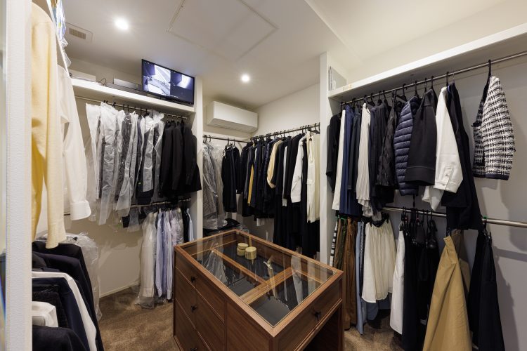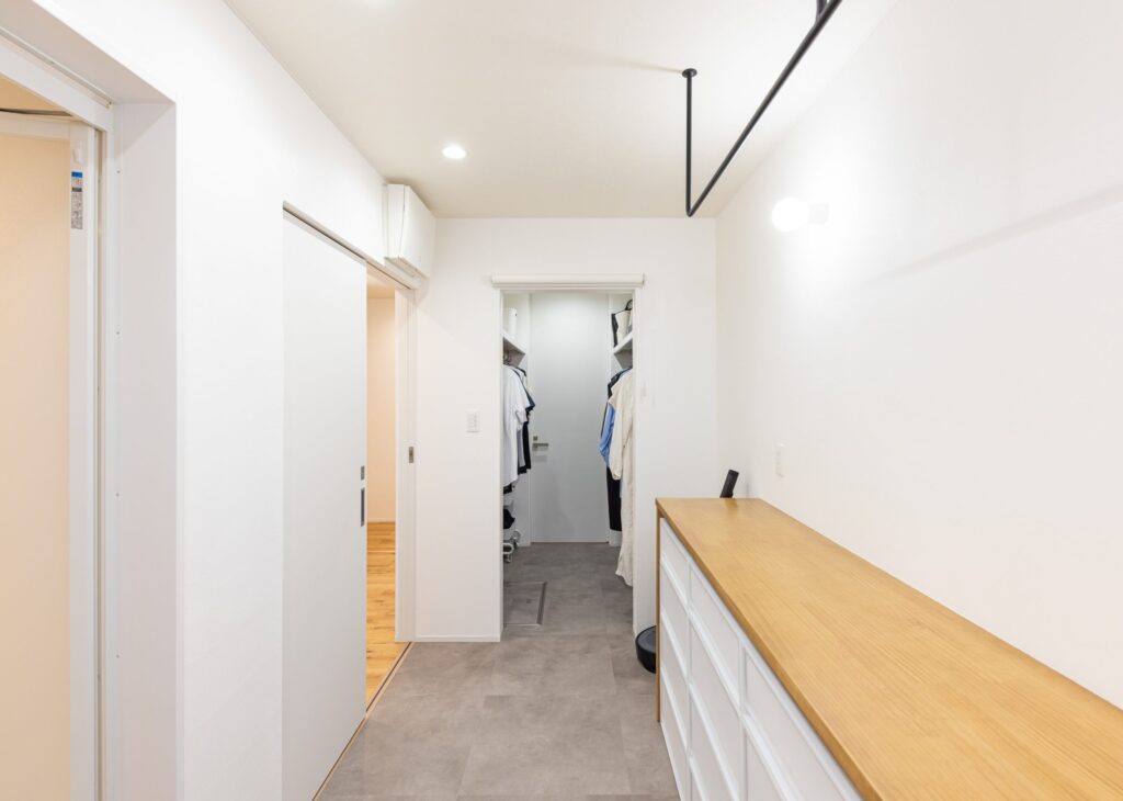 シックなデザインと、効率的な家事動線を実現した住宅の施工事例です。家族全員の衣類や小物を収納できるファミリークローゼットは、ランドリールームとキッチンがつながったウォークスルータイプで、日々の洗濯家事を効率的に行えます。