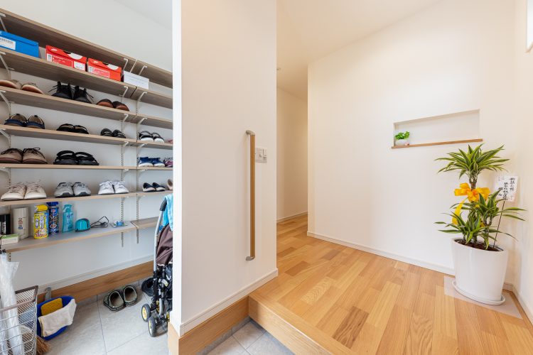 玄関に隣接して設けるシューズインクローゼットは、靴をはじめ雨具やベビーカー、アウトドア用品など、屋外で使う物の収納に便利なスペースです。外の汚れを室内に持ち込まずに済むため、家の中を清潔に保ちやすくなります。十分な広さがあれば自転車などの大型の荷物も収納可能で、屋外での保管に比べて盗難のリスクを減らせるため、防犯面も安心です。