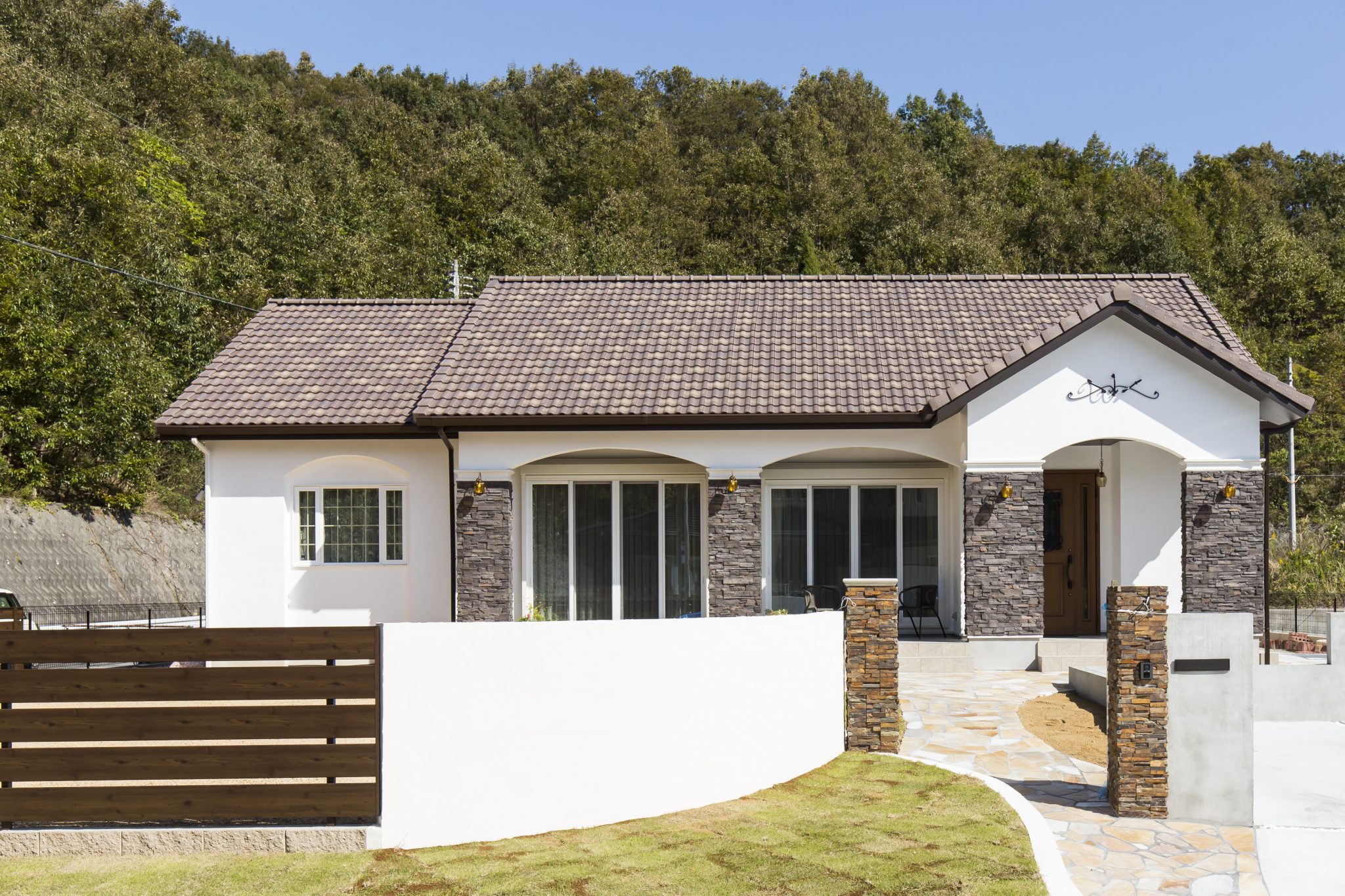 窓枠は通常と異なりアーチ状で柔らかな印象を与え、木製のドアと洋風の瓦屋根が統一感のある外観に仕上げています。