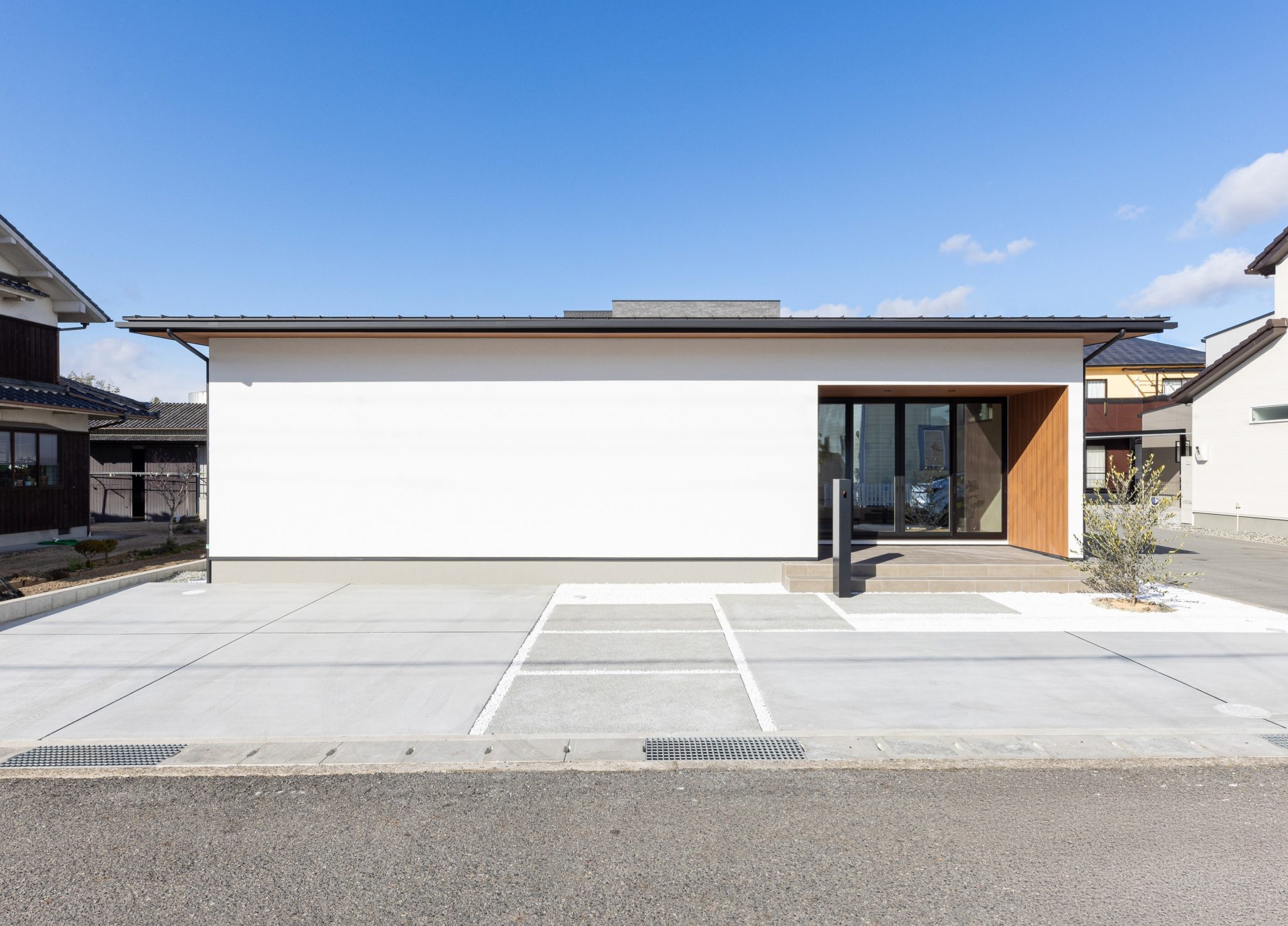 白を基調としたシンプルな外観の平屋