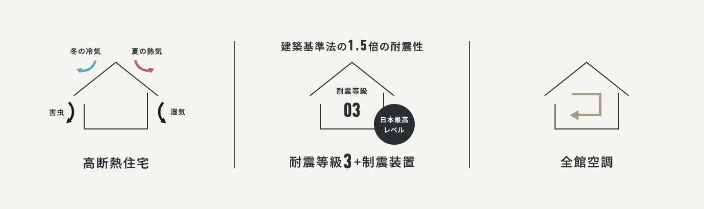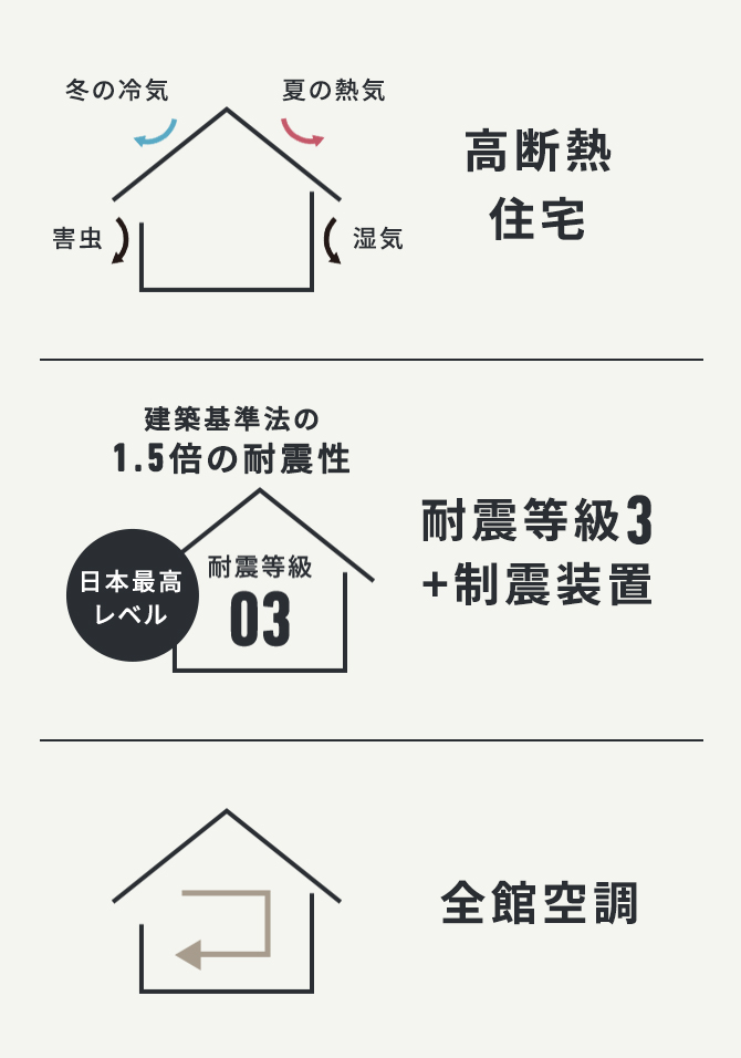 日本トップクラスの高断熱高気密仕様(UA値0.26以下)が標準仕様です。
