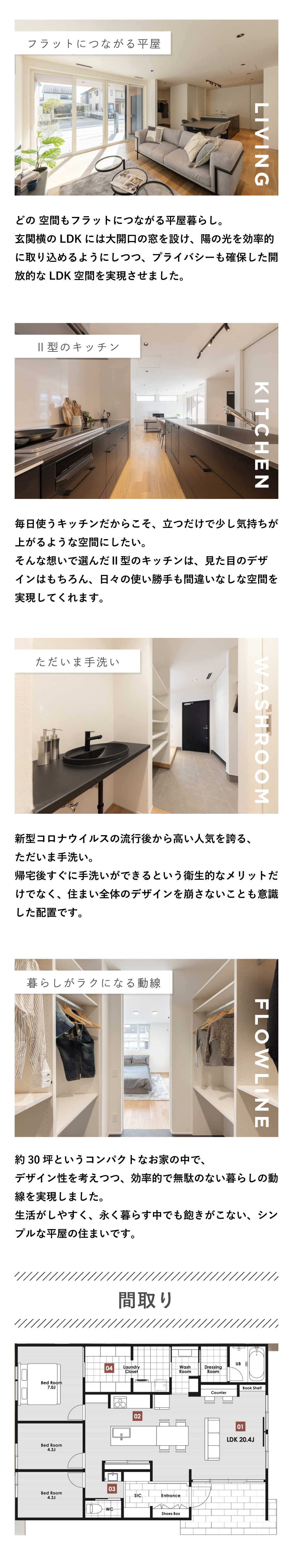 約30坪のコンパクトな設計ながら、無駄のない動線と回遊性を重視したプランになっています。 また玄関からLDKまでがフラットにつながり、暮らしの流れが非常に自然でストレスが少ない造りです。
