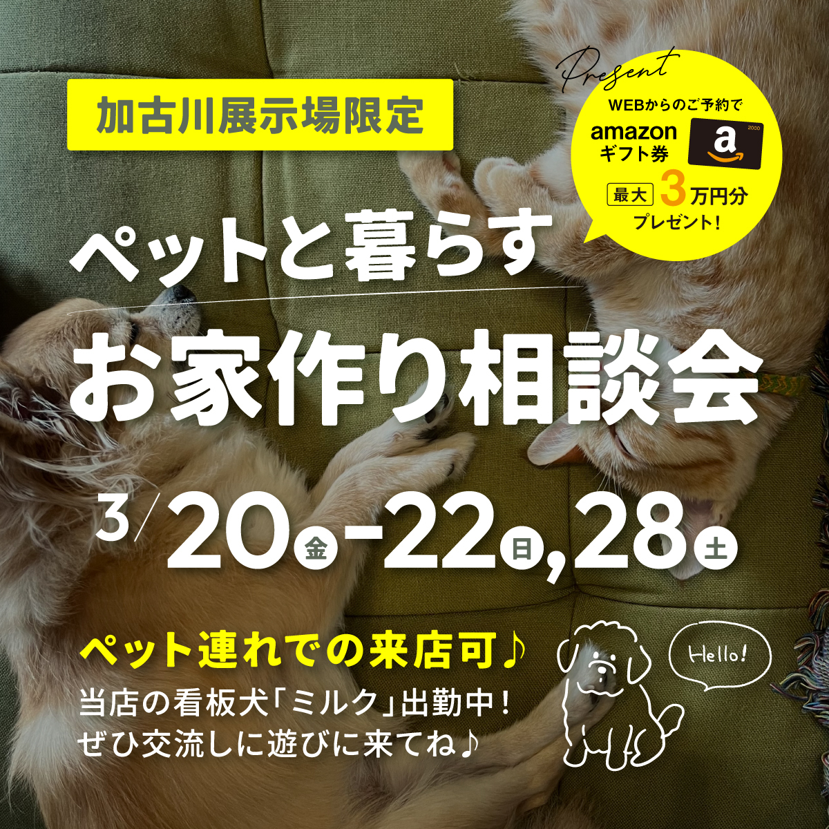 ペットと暮らすお家作り相談会 【加古川展示場限定】 日時: 3月20日(金) 〜 3月22日(日)、3月28日(土) 場所:加古川展示場 イベント名 ペットと暮らすお家作り相談会 【加古川展示場限定】 日時 3月20日(金) 〜 3月22日(日)、3月28日(土) 場所 加古川展示場