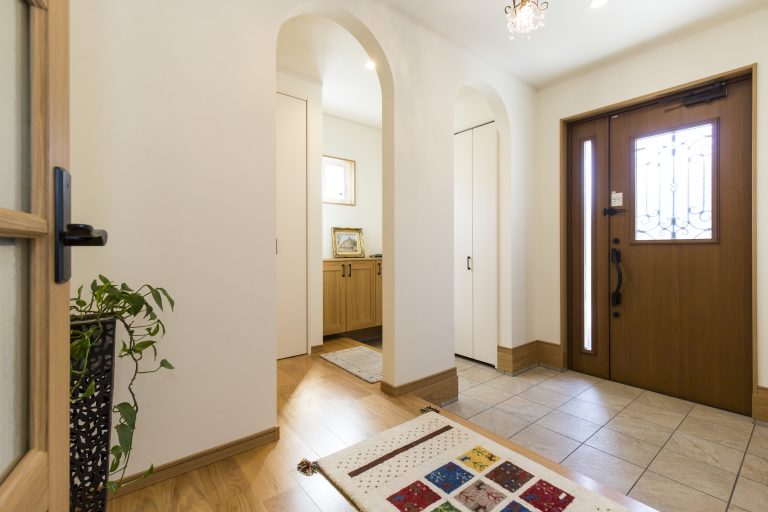 明るく開放感のある玄関も、オーナー様ご夫婦のお家の特徴です。玄関は間取りを贅沢に使う特徴の洋風の家と同様に、広々と明るい空間を目指しました。