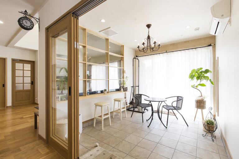 家の外のスペースでは奥様が世話をしたガーデニングを眺めながら、家の中のスペースも広く取ってあるため、お気に入りのプランターで植物が飾れます。ダイニングやリビングで過ごす休日ももちろんよいですが、家の中にいながらも外でお茶を楽しんでいるような気分にさせてくれるスペースがあれば、心のゆとりに繋がるでしょう。