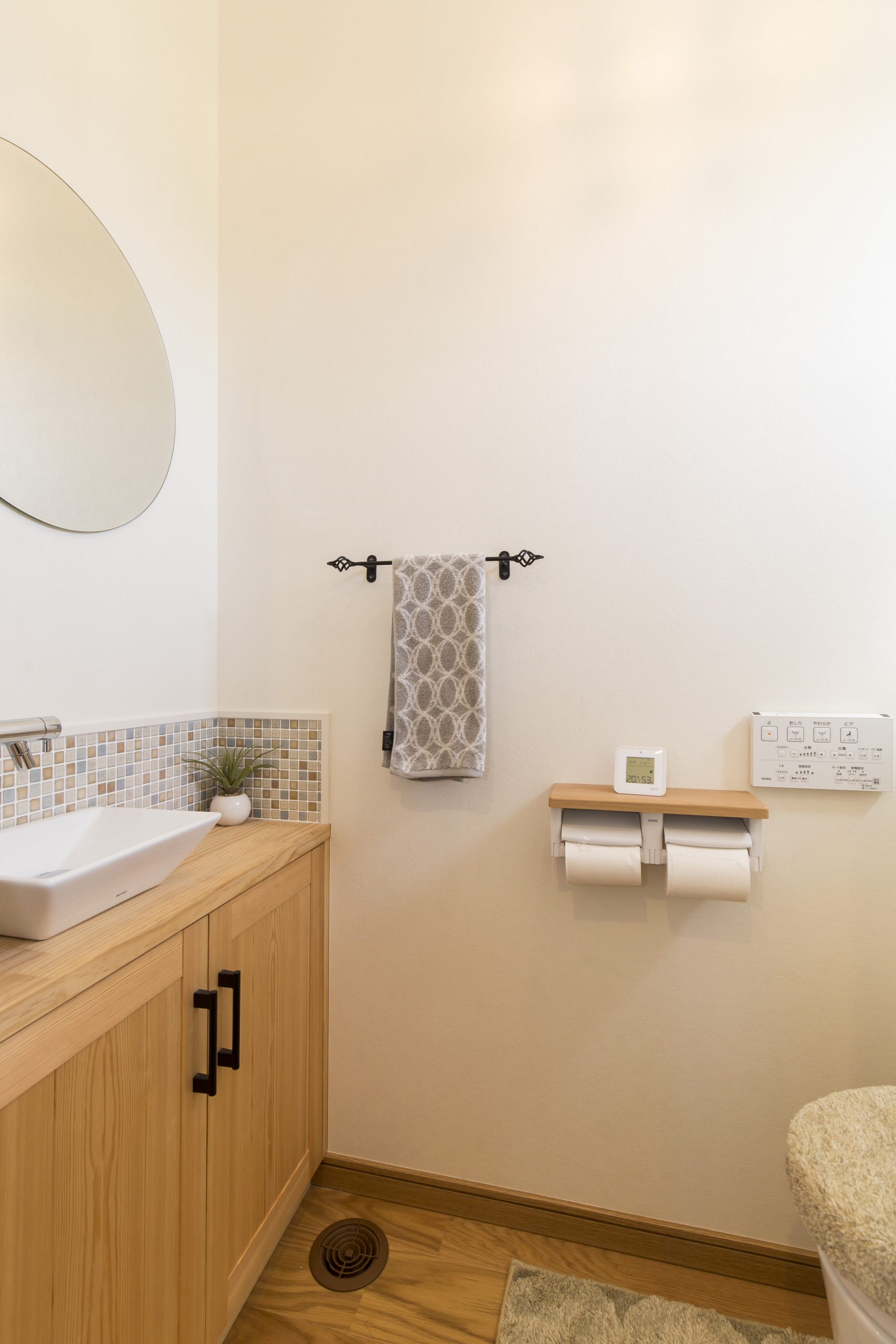 ドアを開けて最初に目に入るアクセントタイルは、オーナー様ご夫婦の雰囲気にぴったりな落ち着いた色味で、帰宅したご夫婦や来客に、安心感を与えてくれます。靴箱のほか、アウトドア用品などの大きめの荷物も入れられる、収納力抜群のクローゼットも備え付けています。