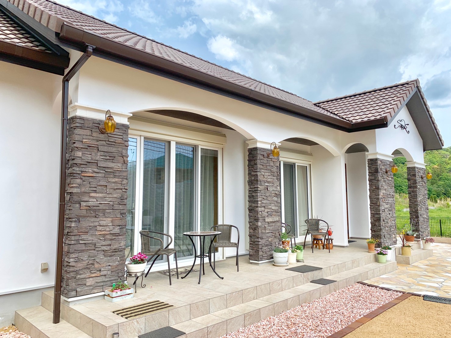 どっしりとした木製の玄関ドアや柔らかなアーチの窓枠、特徴的な屋根瓦と外壁は、ご夫婦のこだわりが感じられます。ヨーロッパのリゾート地を彷彿とさせる可愛らしくも落ち着いた外観は、見る人を惹き込んでくれるでしょう。