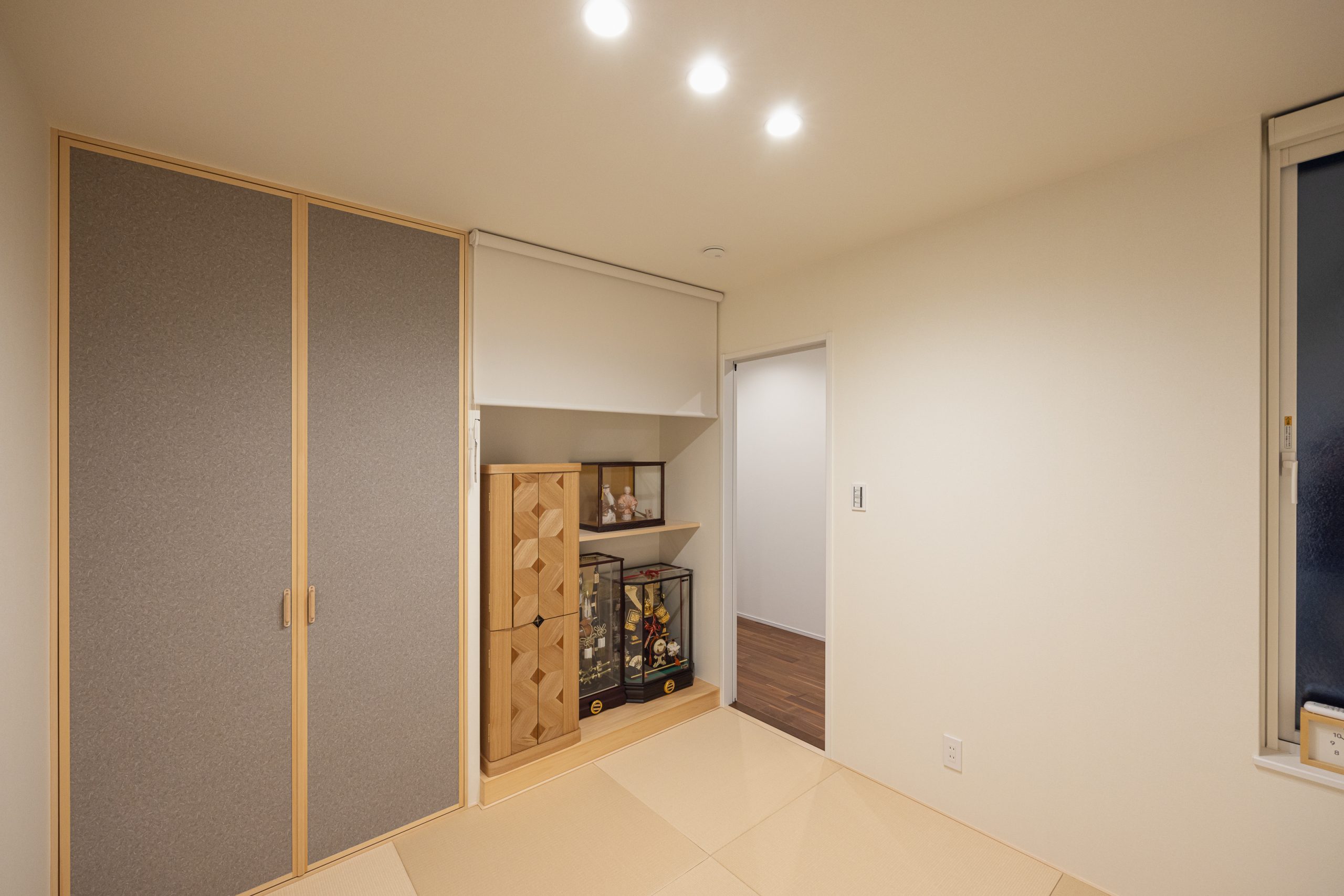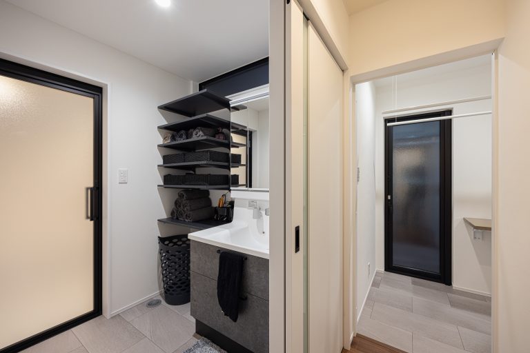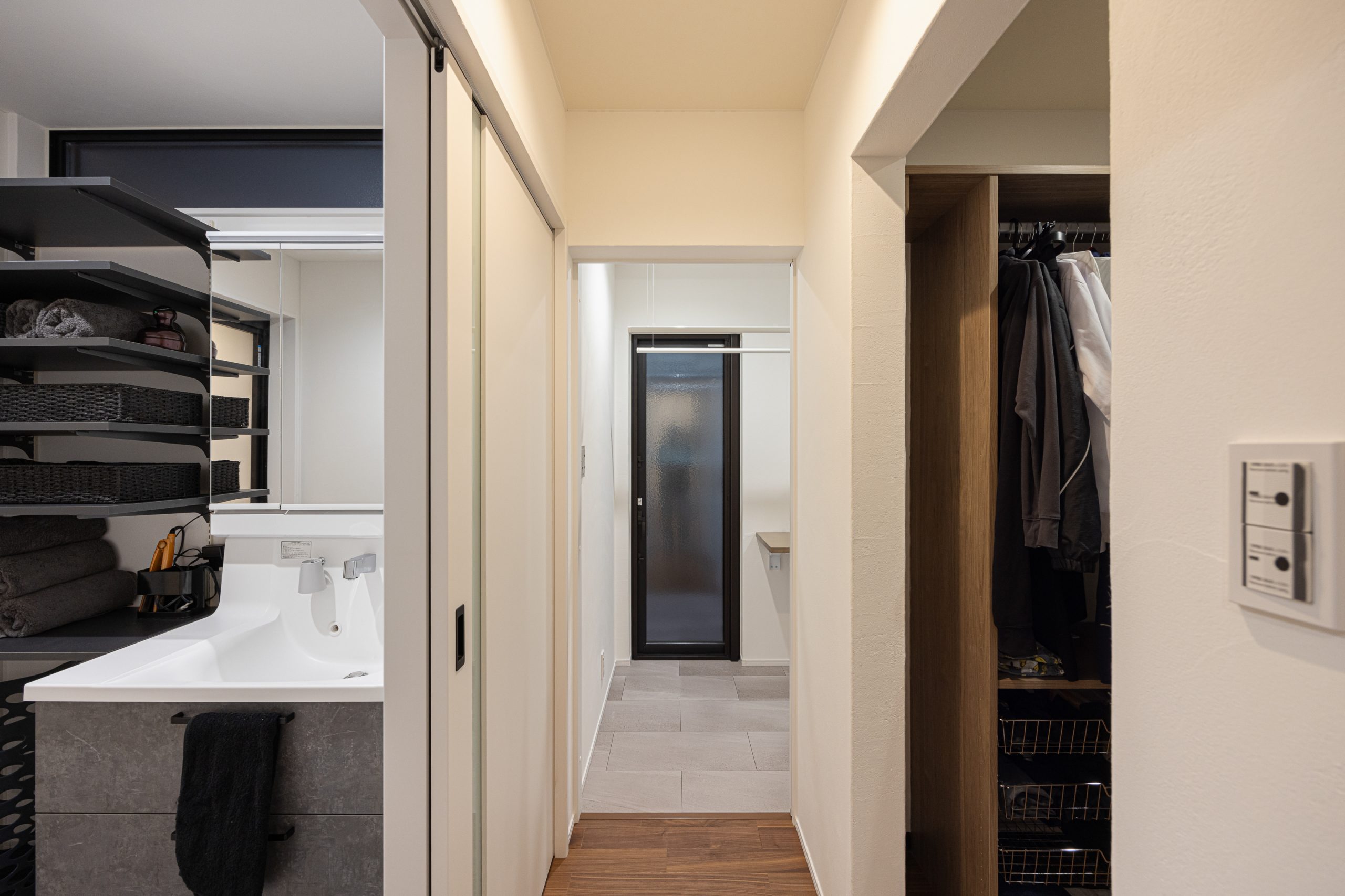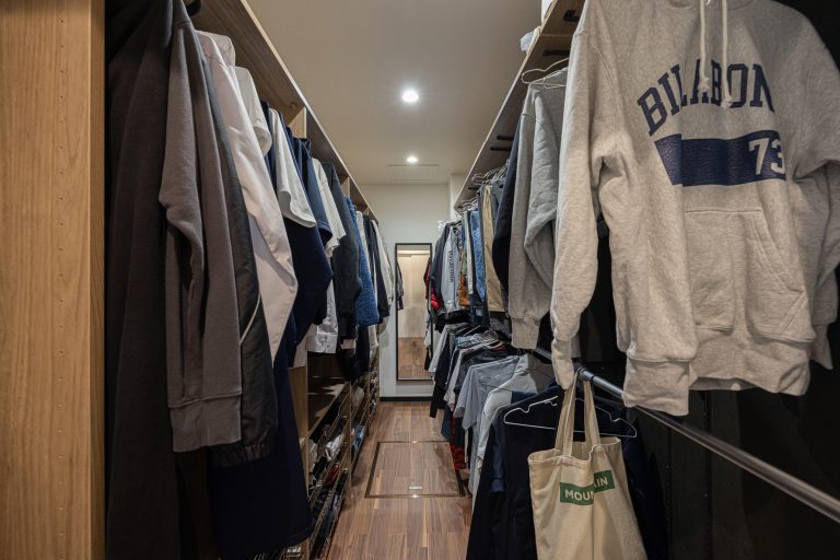 オーナー様邸のファミリークローゼットはキッチンと繋がっており、裏にランドリールーム、横に洗面所と浴室が続くつくりとなっており、家事動線が確立されています。ファリミークローゼットは各部屋の収納スペースを小さくできたり、他の部屋で衣服が散らかりにくかったりするメリットもあるため、これから家づくりをする方は、ぜひ検討してみてはいかがでしょうか。