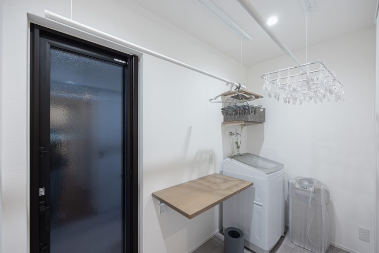 家事効率を上げたいといった奥さまの要望から、ランドリールームも設置しました。洗濯機と物干し竿、作業スペースを一箇所に集めたため、洗濯に関する「洗う、干す、取り込む、たたむ」といった作業を効率良くこなせます。