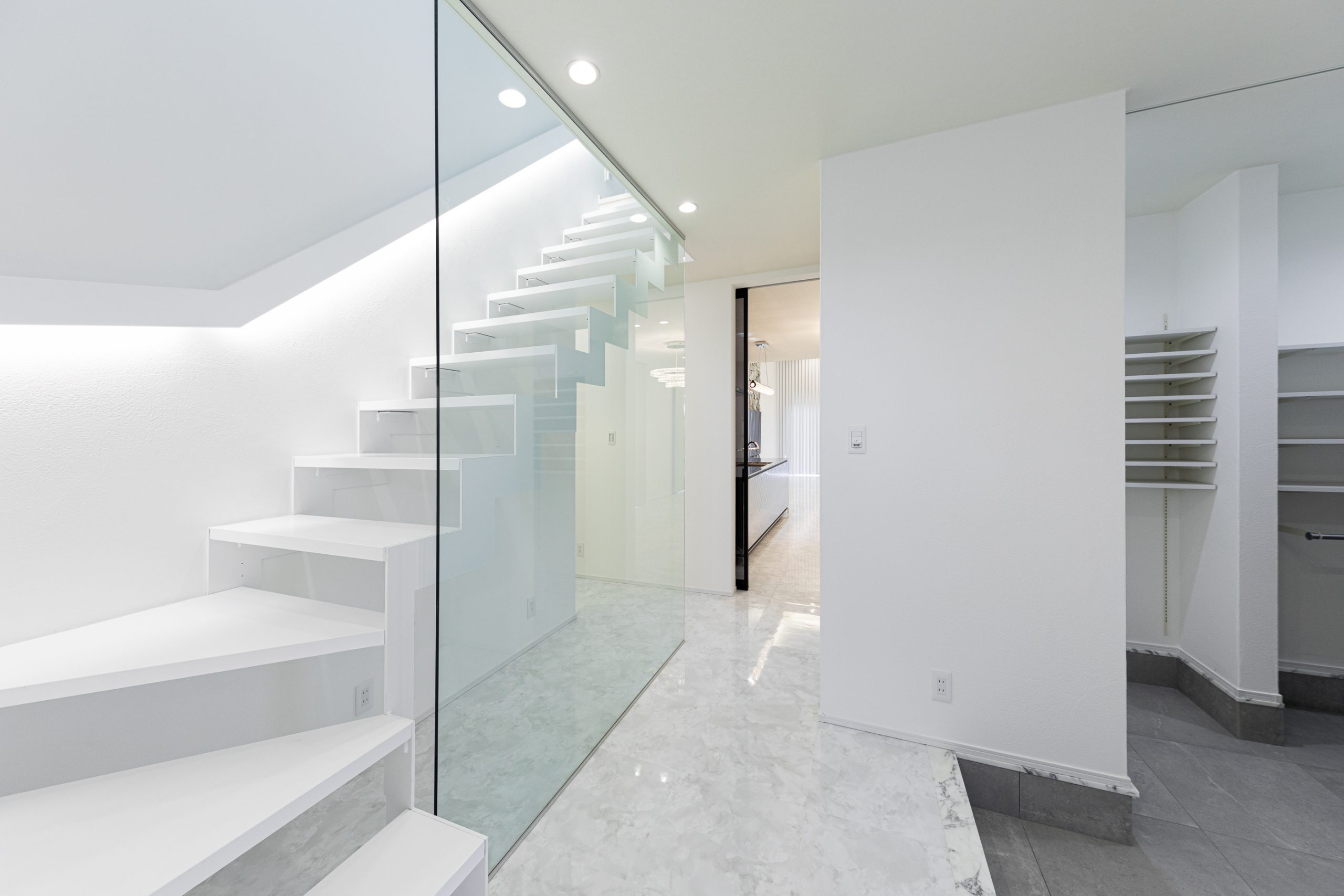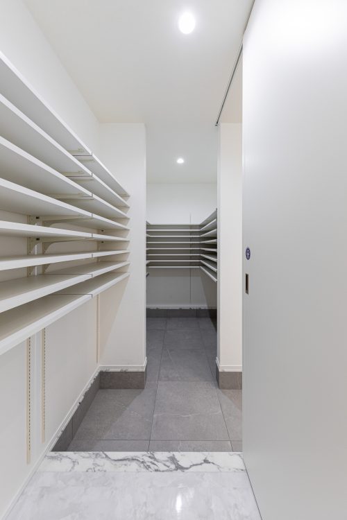 また棚は可動式にしてあるので、ブーツや長靴などしまいたいものに合わせて高さを変えられます。シューズクロークからも移動できるようにしてあるので、動線が確保でき出入りしやすくなっています。