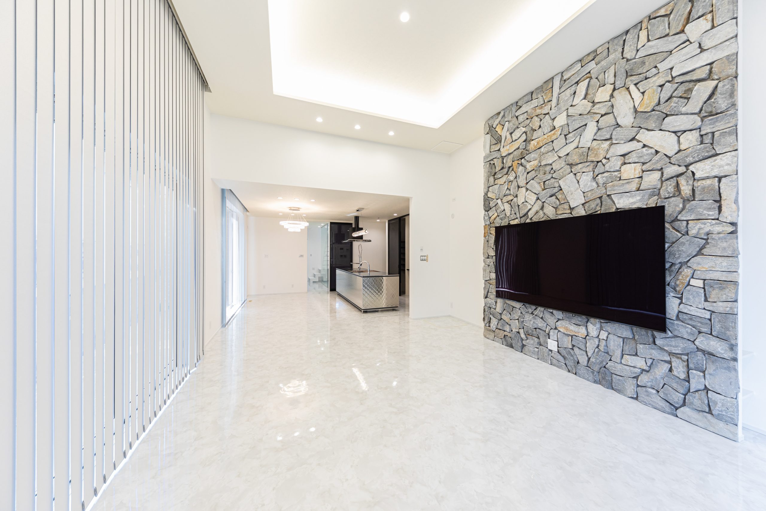 ダイニングと繋がった30帖のリビングは、真っ白で清潔感があり開放的な空間にしています。壁付けのテレビなので広々と感じます。また、天井を折り上げ式にすることでさらに広い空間を作れました。