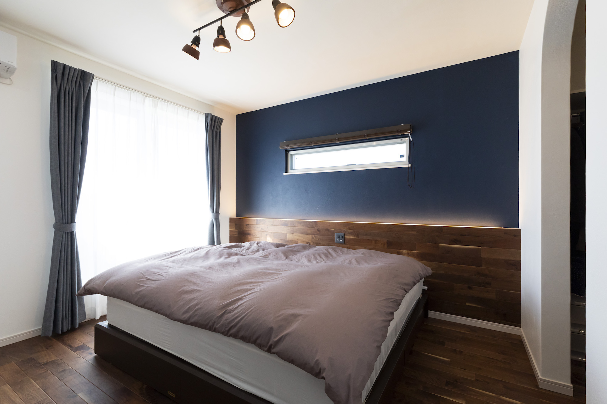 漆喰というと、白色のイメージが強い壁材だと思います。今回は、寝室の壁の1面をアクセントカラーにしたいというご要望に応えるため、漆喰に色粉を混ぜることでネイビーのアクセントウォールを実現しました。
