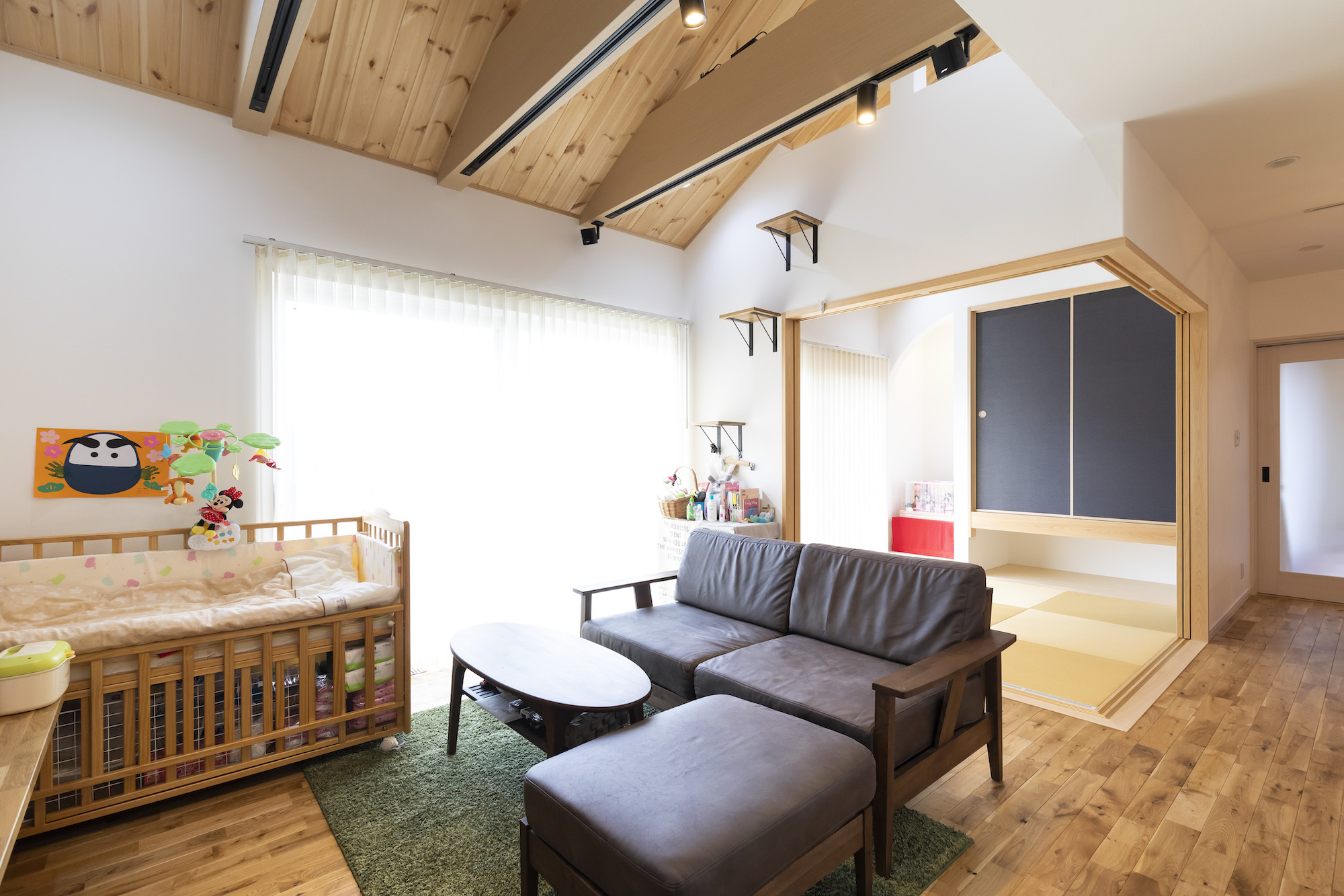 友人を招くことが好きだというオーナー様のために、和室とリビングを勾配天井にすることで、限られたスペースの中でも、広がり感と遊びゴコロが加わり、人が多くても圧迫感を感じにくいゆとりある空間にしました。