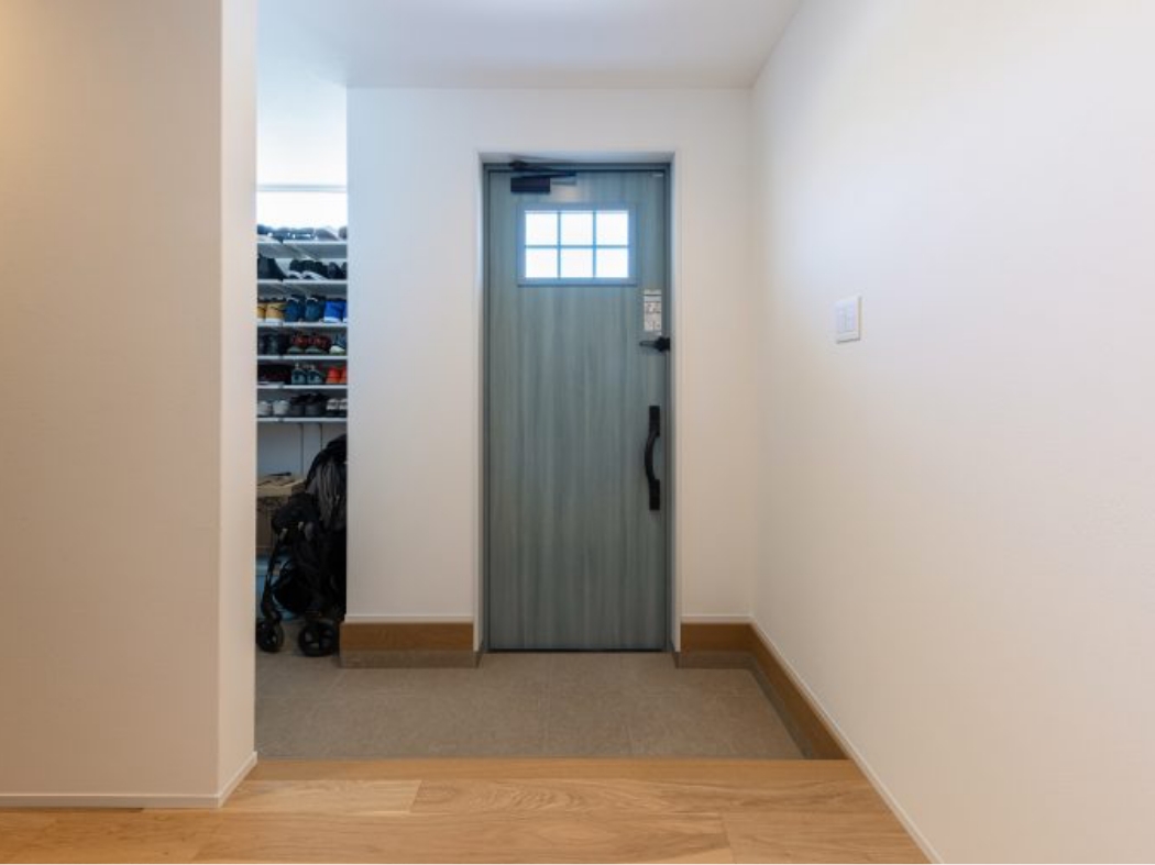 次に紹介するお家の特徴は、爽やかなブルーの玄関ドアが印象的な、実用性にも優れた玄関空間です。 すぐ横には大容量の土間収納を設けており、靴はもちろんベビーカーやアウトドア用品までしっかりと収納可能。 玄関まわりをすっきりと保ちながら、家族みんなの動線にも配慮した設計となっています。帰宅時の使いやすさと、見た目の美しさを両立させた、こだわりの詰まった玄関スペースです。