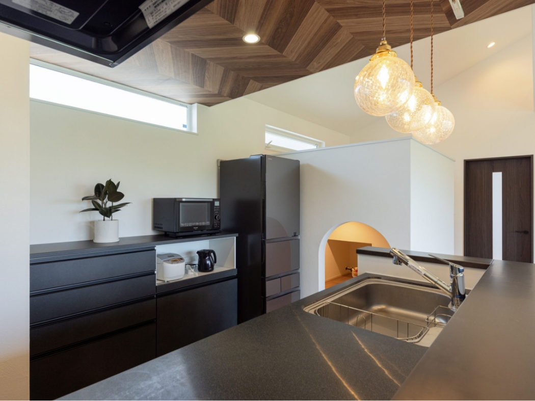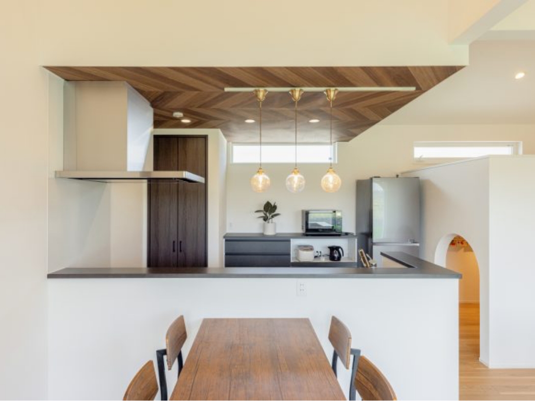 次に紹介するお家の特徴は、印象的なヘリンボーン柄の木目天井とガラスペンダント照明が彩る、洗練されたキッチンです。 落ち着きあるダークトーンのキッチン収納と、やさしい光が降り注ぐペンダントライトが、空間に程よいメリハリを与えてくれます。 ダイニング・リビングと一体感のある配置で、料理をしながら家族と自然に会話が生まれるのも魅力。 デザイン性と使いやすさ、家族のつながりを大切にしたキッチンが完成しました。