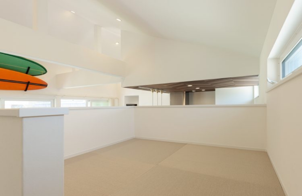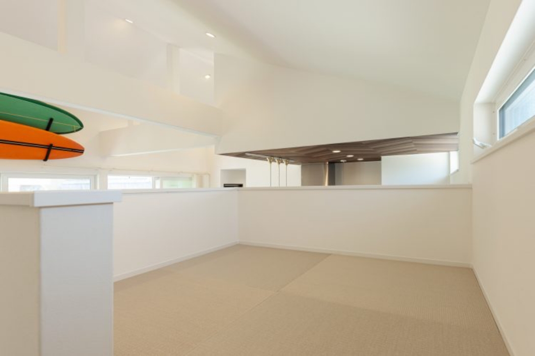 続いて紹介するお家の特徴は、リビング上部に設けられた畳敷きのスキップフロアです。 吹き抜けとゆるやかにつながるこの空間は、子どもの遊び場や読書・昼寝スペースとしても活躍。 下の階の気配を感じながらも、ほどよくこもれる居心地のよさが魅力です。 家族の使い方に合わせて自由にアレンジできる、心地よい“余白”のある場所が完成しました。