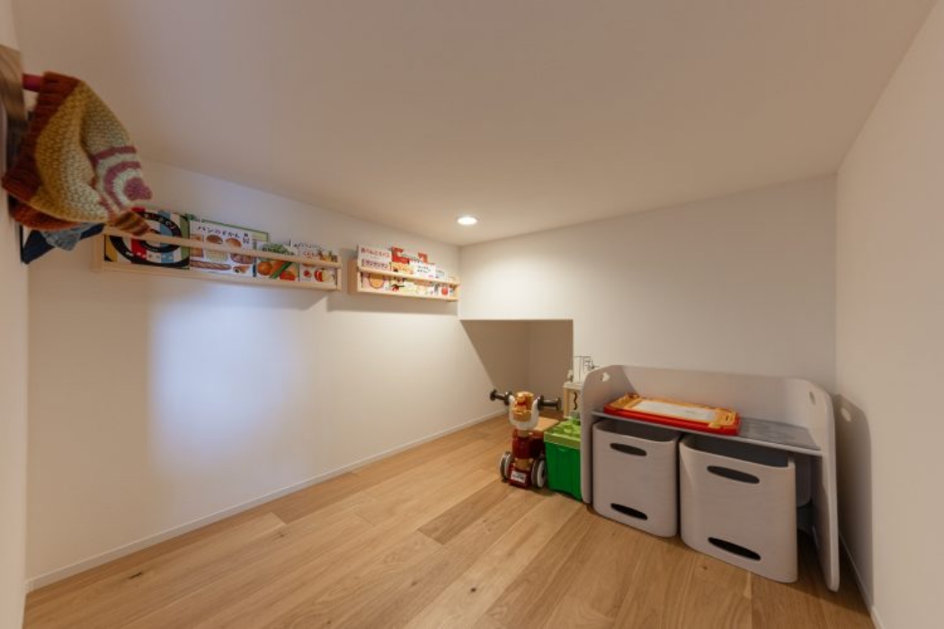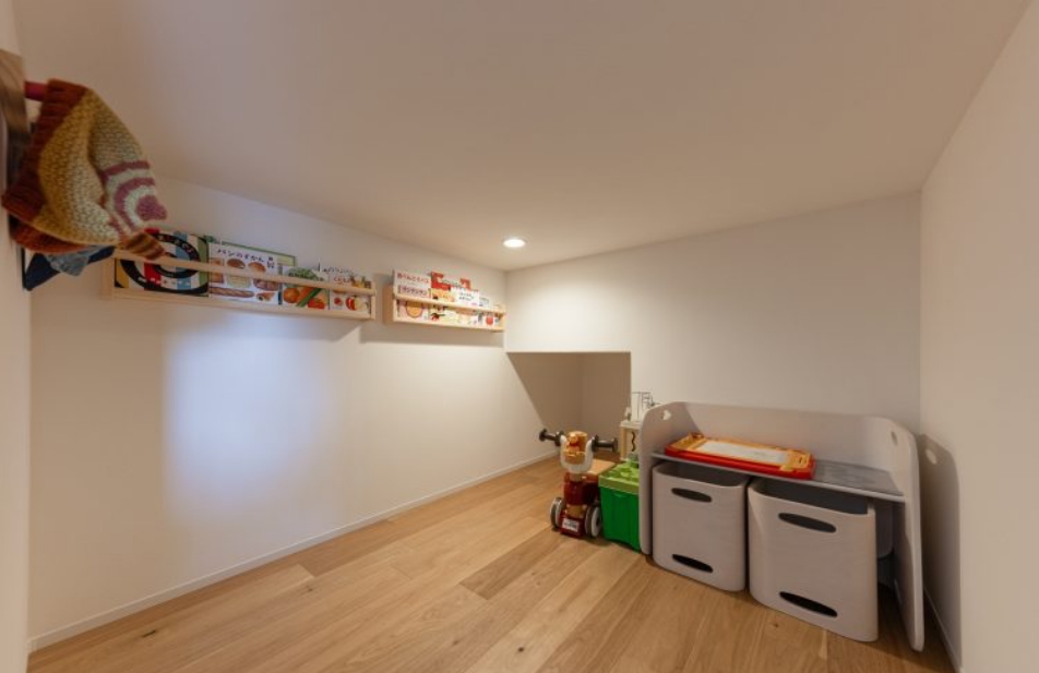 次に紹介するお家の特徴は、キッチン横のスキップフロア下に設けた、お子さまのための“ひみつ基地”のようなスペースです。 小さな身体にちょうどいい天井高と、絵本やおもちゃを収納できる棚を備えた空間は、子どもたちのお気に入りの場所に。 親の目が届くキッチン横にあることで、家事をしながら安心して見守れるのも魅力です。 子どもたちの「楽しい!」を大切にした、家族にやさしい設計が光ります。