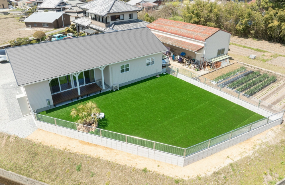 おうち時間がもっと楽しくなる、広々とした人工芝の中庭