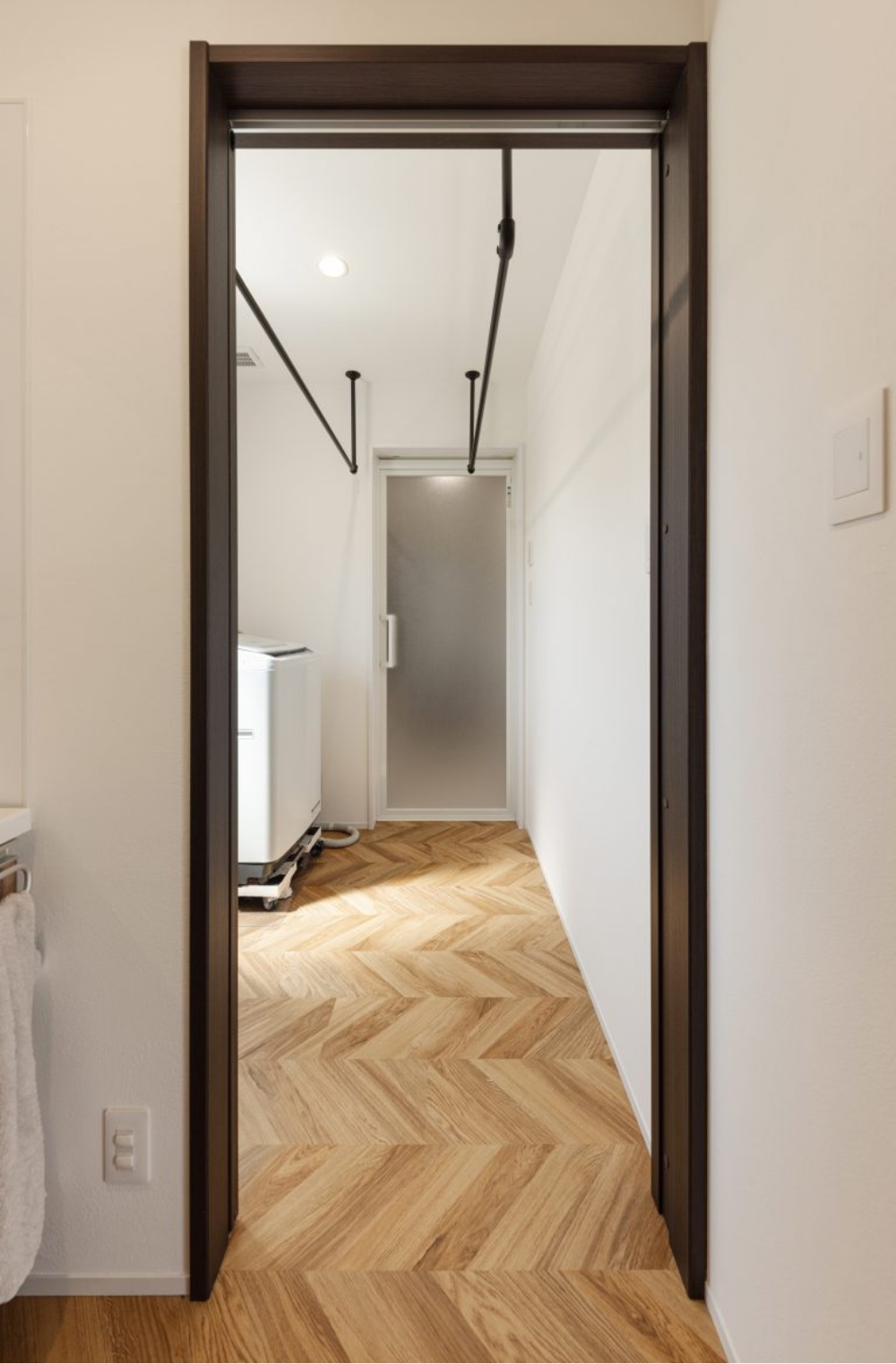 洗面室から洗濯機、物干し、収納までが一直線につながる、無駄のない動線設計。 天井に設置されたアイアンバーで室内干しもスマートにこなせ、天候に左右されずに洗濯できるのも嬉しいポイントです。 毎日の家事をスムーズに、そして快適にこなすための工夫が詰まった、効率的で美しいランドリースペースです。