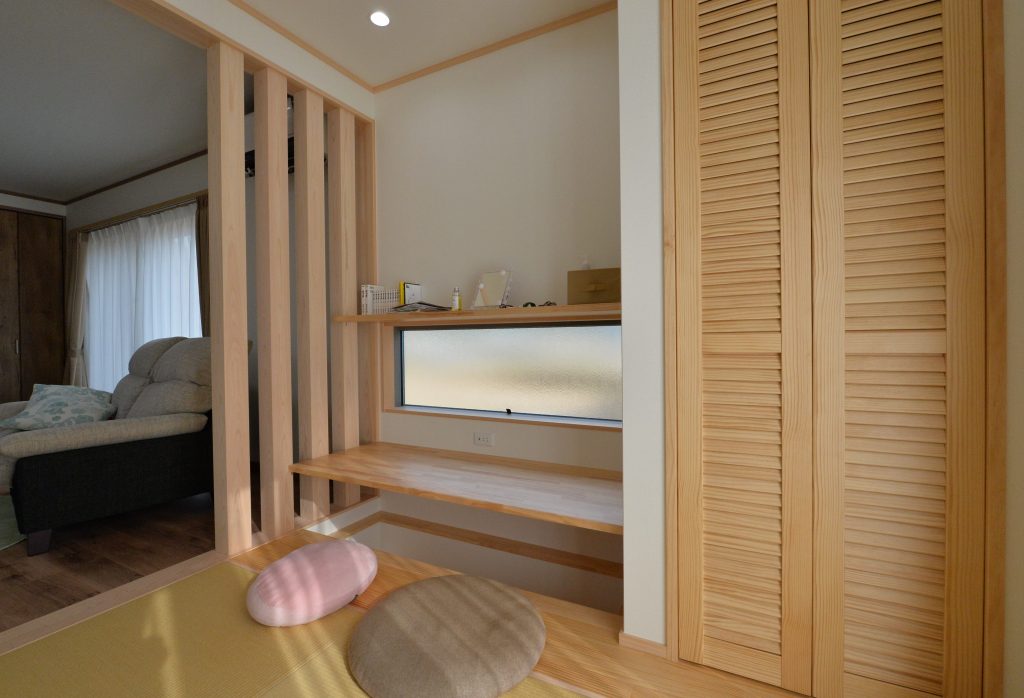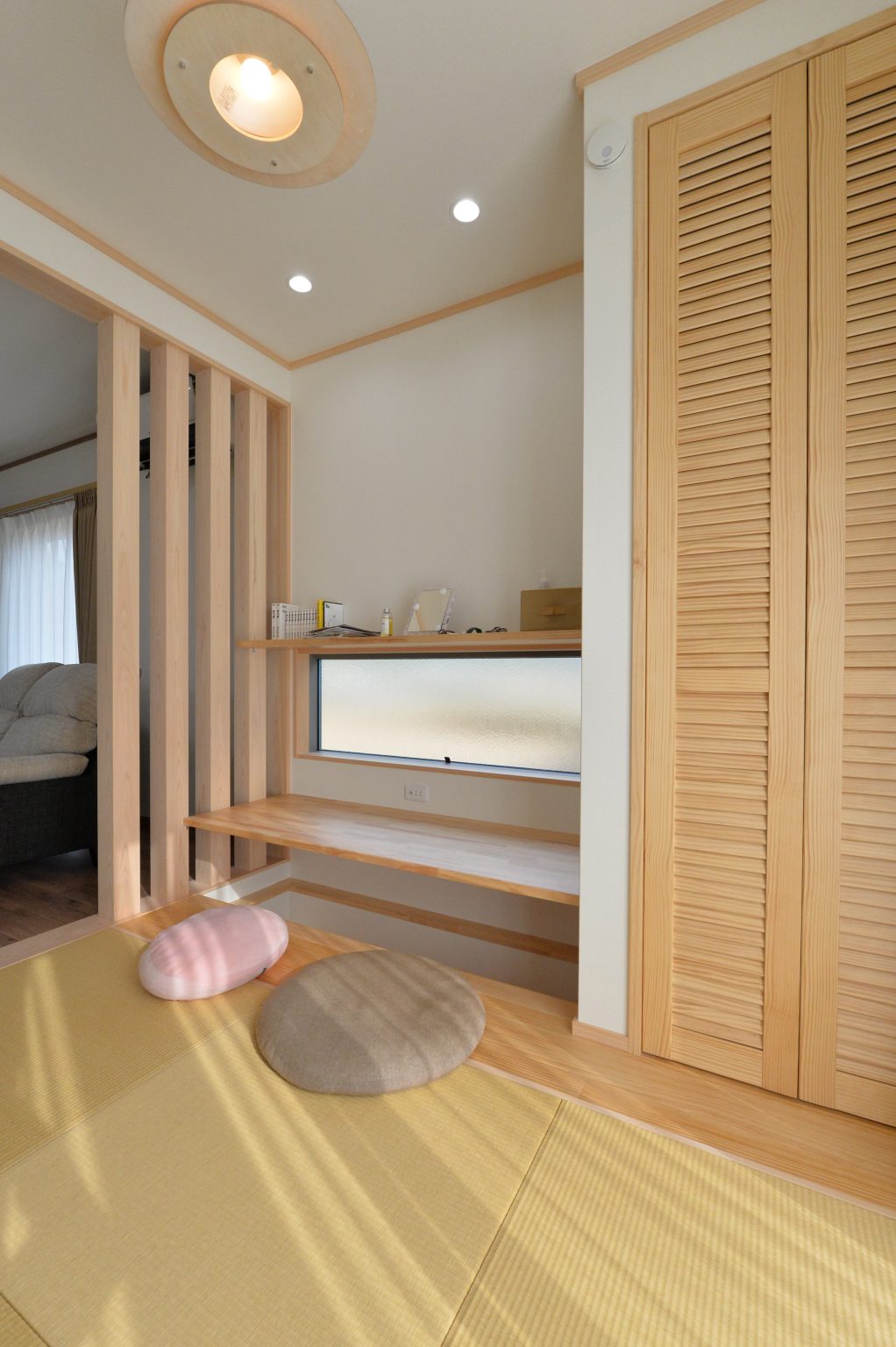 最後に紹介するお家の特徴は、小上がりの和室です。畳のある空間を取り入れることで、リラックスできる癒しのスペースを実現しました。 小上がり部分を活かし、一角には掘りごたつ式のワークスペースを設置。コンセントも備え付けているため、仕事や読書など多用途に活用できます。 また、段差を利用して座ることができるため、リビングとのつながりを持たせながら、ちょっとしたくつろぎスペースとしても使えるのが魅力。機能性と快適さを兼ね備えた、こだわりの和の空間になりました。