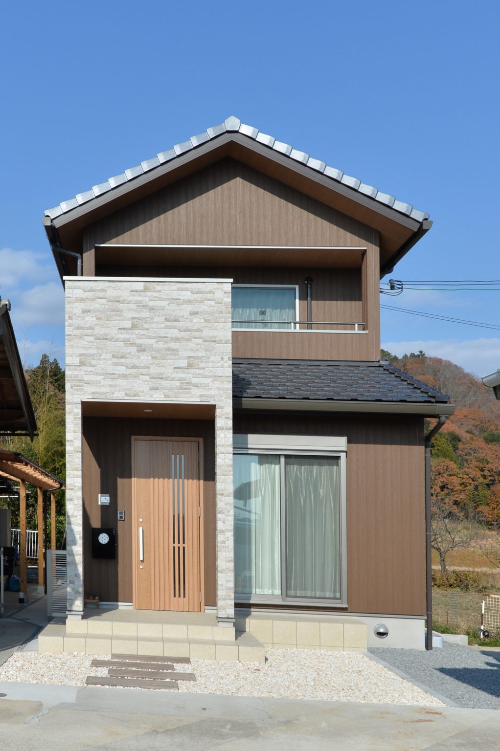 最初に紹介するお家の特徴は、ブラウンを基調とした和モダンな外観です。落ち着きのある色合いに瓦屋根を組み合わせ、どこか懐かしさを感じるデザインに仕上げました。 玄関ポーチにはレンガ調の外壁を採用し、訪れる人を温かく迎える印象に。さらに、ポストには和柄を取り入れ、外観のアクセントとしてさりげなく個性を演出。細部にまでこだわりを詰め込んだ、美しさと機能性を兼ね備えた住まいです。
