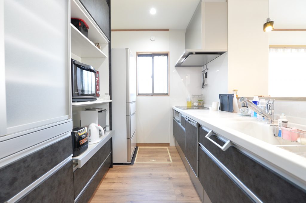 キッチンは、機能性とデザイン性を両立させた空間になっています。家電や食器、ストック類をしっかり収納できるスペースを確保し、常にすっきりとした状態を保てる工夫がされています。 全体をモノトーンで統一することで、洗練されたスタイリッシュな雰囲気に。無駄のないシンプルなデザインながら、使いやすさにもこだわりました。