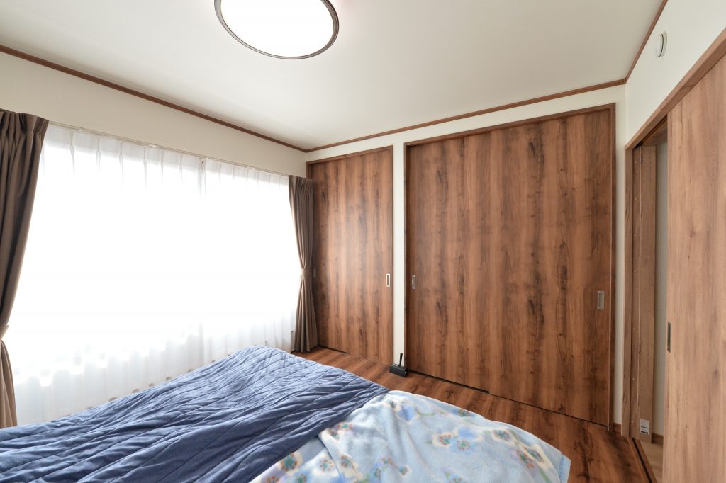 寝室は、落ち着きのあるブラウンを基調にまとめ、リラックスできる空間に仕上げました。色味を統一することで、心が安らぐ上質な雰囲気を演出しています。 また、大容量のクローゼットと収納を配置し、洋服や寝具をしっかり整理できるように。朝の支度もスムーズに行えるため、忙しい時間帯のストレスを軽減してくれます。 さらに、大きな窓を設置することで、朝日や日中の光をたっぷり取り入れることが可能に。自然の明るさを活かし、より開放感のある快適な寝室が完成しました。