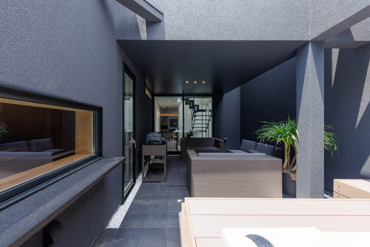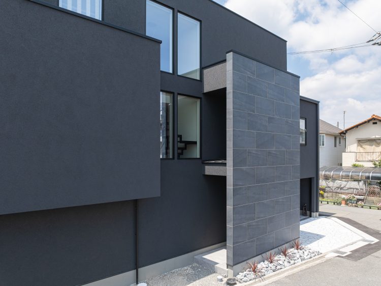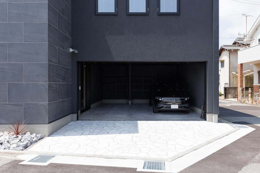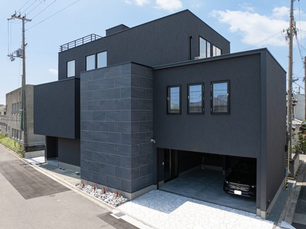 はじめに紹介するお家の特徴は、黒色の外壁で重厚さがあり、凹凸がインパクトのある外観デザインです。3階建て+屋上のある家となっているため、外観から大きなインパクトがあります。インナーガレージは車も2台止められ、雨風から守り防犯面も考慮して設計しました。インナーガレージ内から室内へのアクセスも可能なため、移動がスムーズにできます。