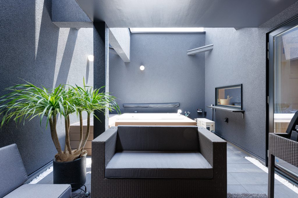 続いて今回の1番の注目ポイントである、アウトドアリビングです。こちらは、室内から続く半室内のような形で、アウトドアリビングを採用しました。夕食を室内ではなく、室外でとったり、ご友人を招いてバーベキューなどをすることができます。また、お施主の要望で、ホームサウナ+ジャグジー+アウトドアリビングで外気浴までの動線を完璧にしたつくりになっています。