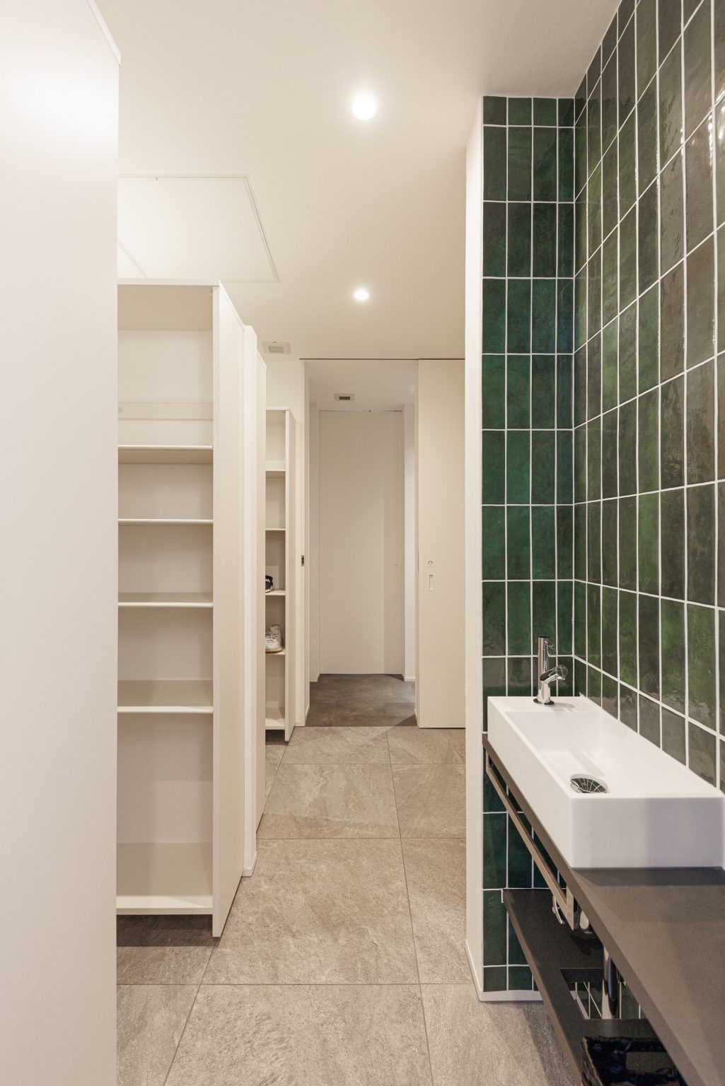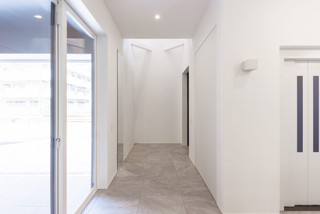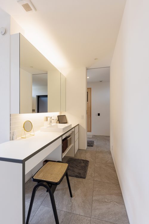 玄関をまっすぐ進むと、大容量の収納スペースを設けています。お出かけ前のコート類や稼働式の棚で大きな荷物を収納することができ、洗面スペースもあるため、屋外から帰ってきた際は手洗いうがいをスムーズに行うことができます。