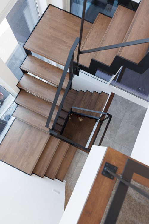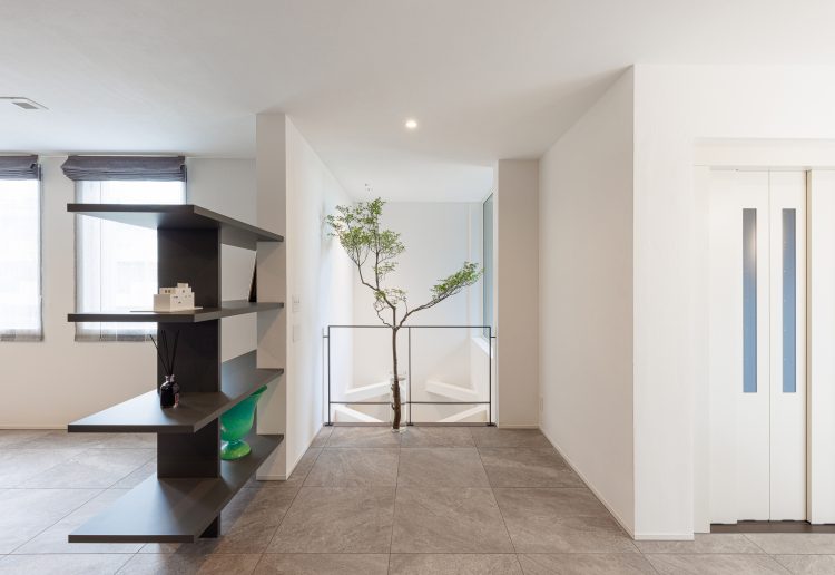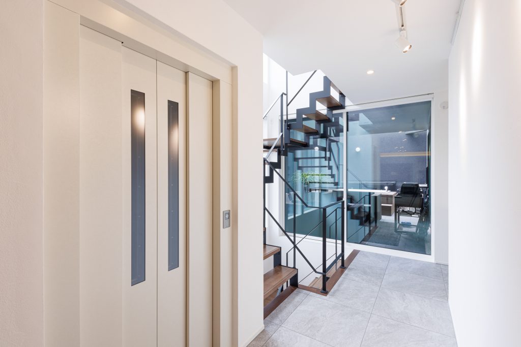 続いては、3階建てということもありお施主様の要望で家庭用エレベーターを設置しました。重い荷物を運ぶ際や将来のことを考慮して移動をスムーズにするために設置しております。2階、3階への移動はスケルトン階段でも可能で、1階~3階まで吹き抜けですべてつながっており、FIX窓で採光を十分に確保し、いつもで明るい空間になっています。
