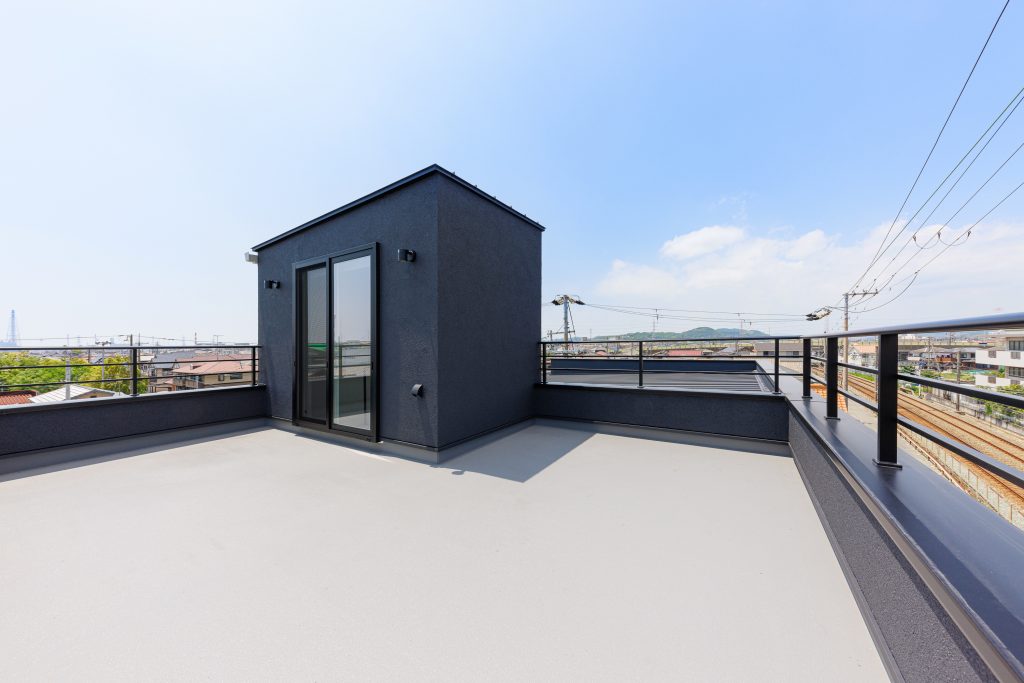 3階から続く高級感あふれる絨毯の階段を上ると屋上テラスがあります。 階段部分の素材には、セルロースファイバーを使用しており、弊社のセルロースファイバーは、吸音効果と足音がしなく、夜でも静かに移動できます。 お施主の要望で、花火大会などをご自宅で見れるように他の家のよりも高い位置で屋上テラスを設置しました。十分なスペースがあるため日光浴や夜空を眺めたりと、活用性は十分にあります。