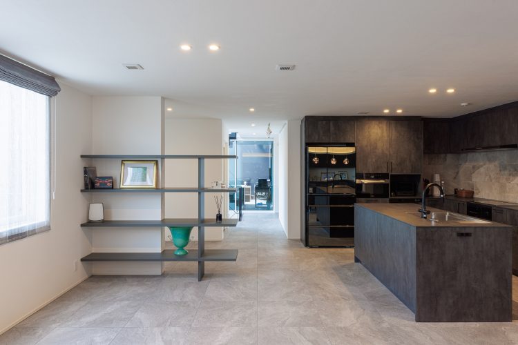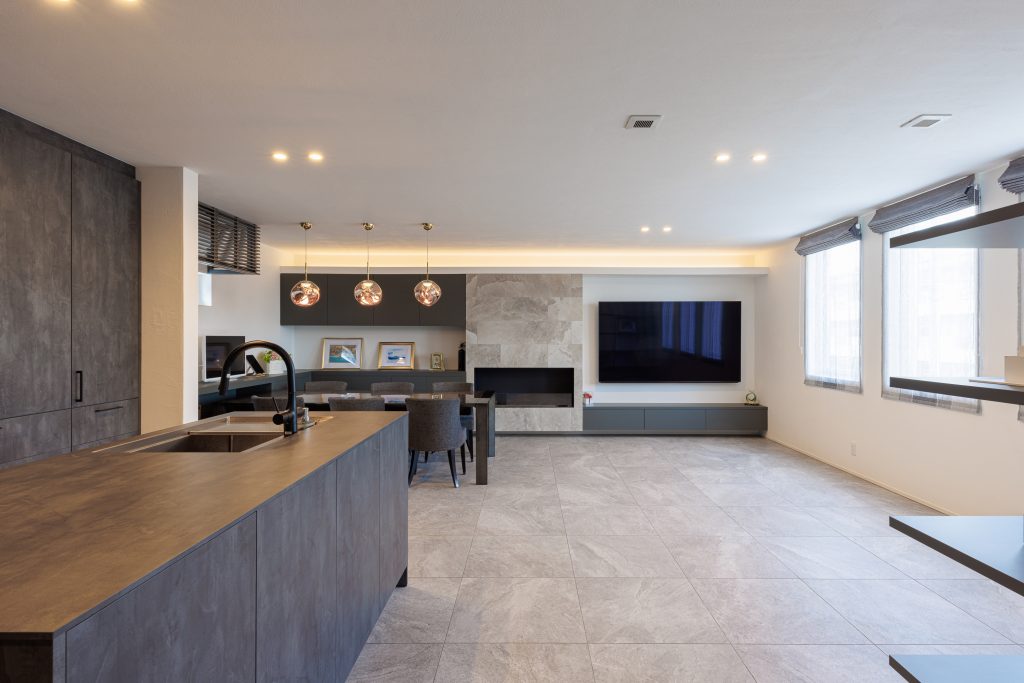 LDKには、正面のバイオエタノール暖炉が印象的な大きく広くゆとりも持った空間で家族団らんの時間を楽しムことができます。暖炉には、輻射熱で冬場でも部屋全体を温めてくれる+きれいに収めるためにオーダーメイドで壁面タイルを張っています。 また、キッチンハウスのキッチンを採用し、濃い目のグレーで落ち着いたキッチンにしました。LDK全体部分は、壁面収納を設置し、目につかないように収納でき、インテリア中心のLDKが可能になっています。