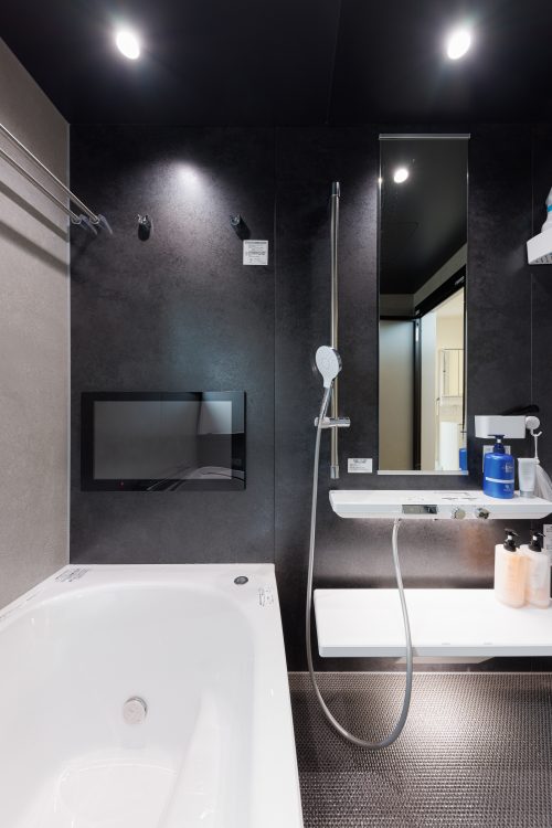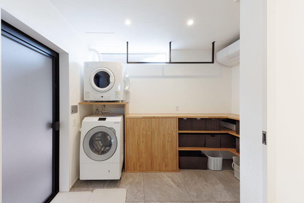 家事効率をアップさせるために、洗濯機+ガス乾燥機+部屋干しスペースを完備したランドリールームを設置しました。横にはバスルームもあり、お風呂の時間も快適にできる肩湯型の浴槽にしています。お風呂場内には、モニターも設置しているため、お風呂に入っていてもテレビや映画、YouTubeを鑑賞することができます。