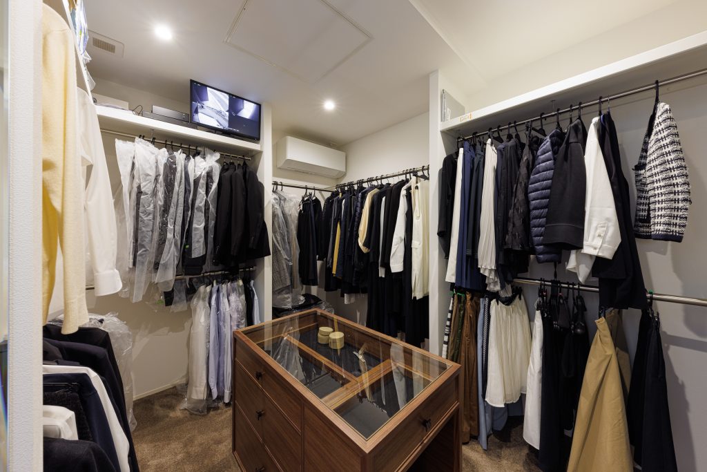最後に紹介するお家の特徴は、ドレッサールームです。入るための扉は、両手にものを持った状態でも開けられるように、通常の引き戸、開戸ではなくスイングドアを採用しています。奥様こだわりの洋服をスッキリと収納できるほか、オーダーしたジュエリーボックスがあります。