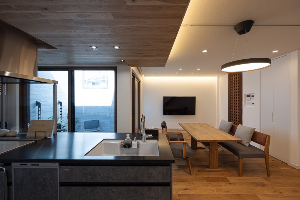 オーナー様ご夫婦の家づくりの要望は、来客に自慢できるような中庭と、シックでモダンな外観、木のぬくもりを感じられる内装です。中庭は小さなお子さまがいらっしゃるわけではないからと、走り回れるような大きなものではなく、ご家族でくつろげる中庭を希望されました。 また外観はシックでモダンながら、一歩家に入ると、木のぬくもりが感じられる内装が理想だとお話しいただいたオーナー様。家事を主にこなしている奥様からは、賃貸では中々叶わない効率的な家事動線が欲しいとの要望もあり、応えられるプランニングをおこないました。 ご家族の要望を叶えた理想のお家には、どのような特徴があるのでしょうか。次から順番に紹介します。