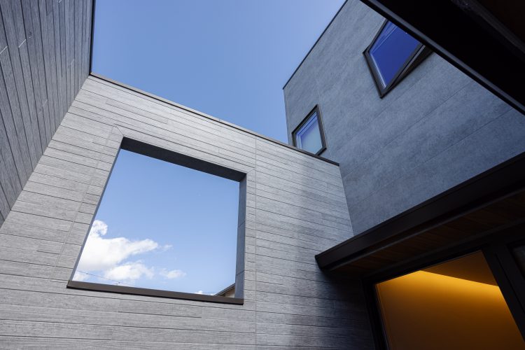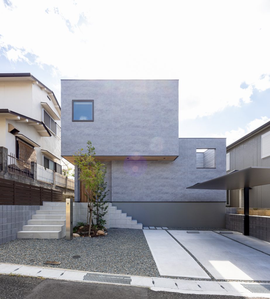 はじめに紹介するお家の特徴は、シックでモダンな外観です。長方形を2つ重ねたような特徴的な外観は、道を行く人の目を惹くほど、スタイリッシュな雰囲気を出してくれます。 落ち着きのあるグレーカラーの外観は、自然との相性も良いため、玄関扉の木目や、庭先の植栽をより引き立てるのにも効果的です。近頃はシンプルモダンな家を目指して、窓のない外観の家も増えてきていますが、あえて窓や、中庭の壁に採光用開口部を配置することで、人を迎えてくれる温かさを感じられる工夫もしています。