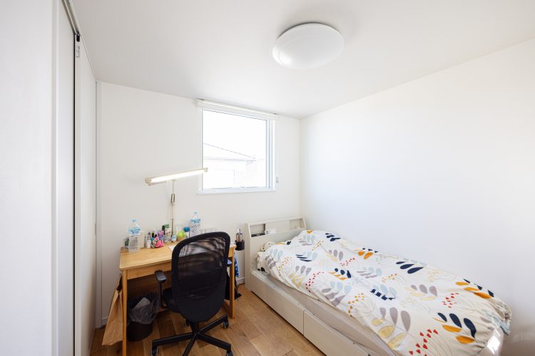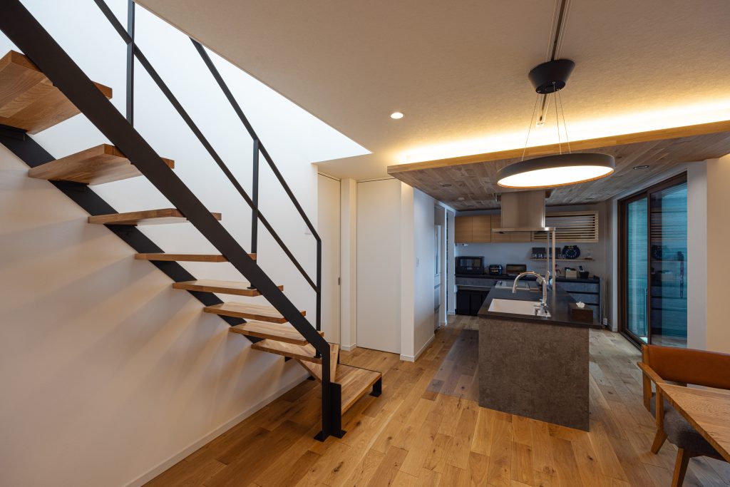 二階へと続く階段は、リビング内に設置しました。手すりと踏み板だけのスケルトン階段は、窓から差し込む光や照明を遮らないため、空間の明るさを保てます。 リビングに設置したことで、家族の帰宅や外出を把握しやすく、コミュニケーションも増えるでしょう。またリビングと二階の空間を繋いでくれるため、別の部屋で過ごしていても、家族の気配を感じられる点が特徴です。
