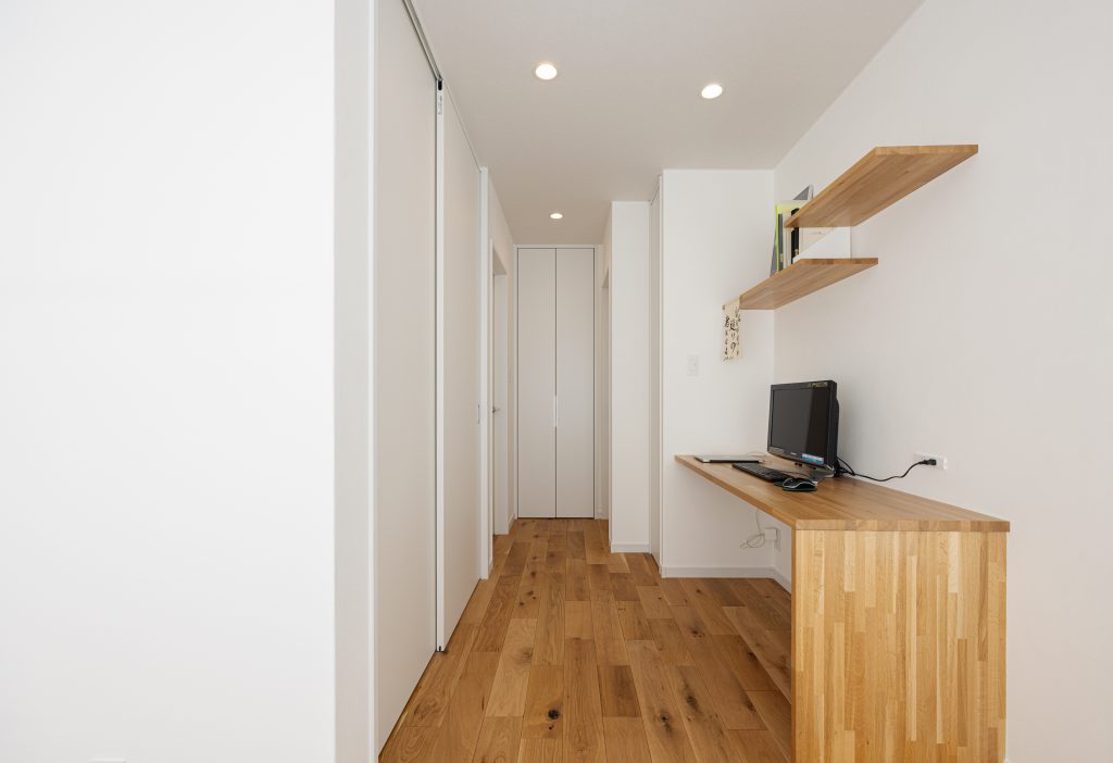 最後に紹介するお家の特徴は、廊下を利用したワークスペースです。コンパクトながら、スペースを最大限に活用している点も、オーナー様ご夫婦のお家の特徴で、スケルトン階段を上がった二階にまず見えるのは、ワークスペースです。 階段を上がる壁に設置された窓と目線が一緒になるよう設計されたワークスペースであるため、自然の光を感じながら調べ物ができるでしょう。他にも個室の収納をオープンスペースにするなど、空間を利用し、開放感を感じられる工夫がしてあります。