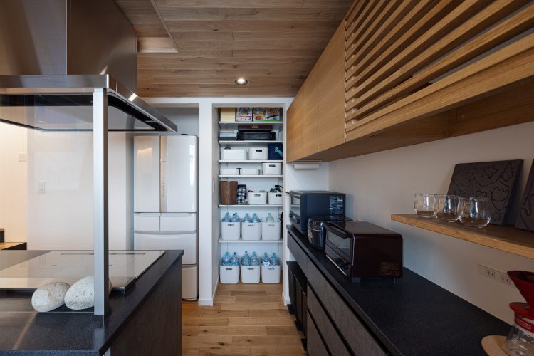 奥様からの「効率的な家事動線」というご要望には、アイランドキッチンを提案させていただきました。アイランドキッチンとは、壁面から離れた場所に設置しているキッチンで、デザイン性や開放感があるだけではなく、前後左右にスペースがあるため、作業動線が良く、家事効率を高められます。 キッチンの後ろに配置したドアは、洗面所や浴室に繋がっているため、洗濯をしながら料理することも可能です。キッチン家電を置くラックやパントリーも壁際に設置しているため、アイランドキッチンの作業スペースは広く保たれたまま使用できます。 ご家族はもちろん、ご夫婦のお友達を呼んで集まりをする際に、多くの人が集うキッチンとなることでしょう。