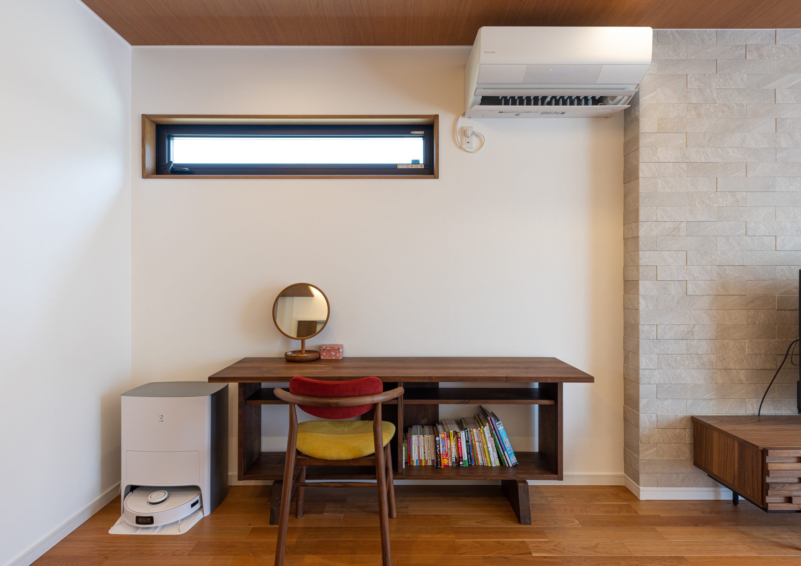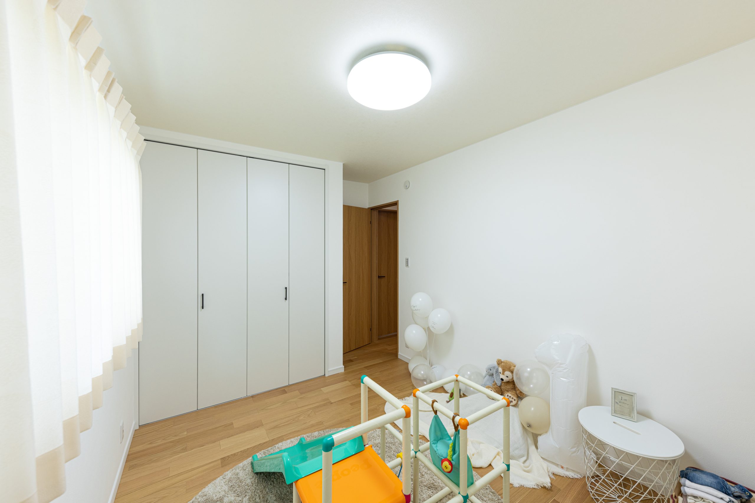 最後に紹介する階段下スペースは、子供部屋です。窓から光が入り明るい部屋になるように設計しました。さらに、白い漆喰の壁でフォトスペースも作成し、家族の思い出を作る部屋になりました。