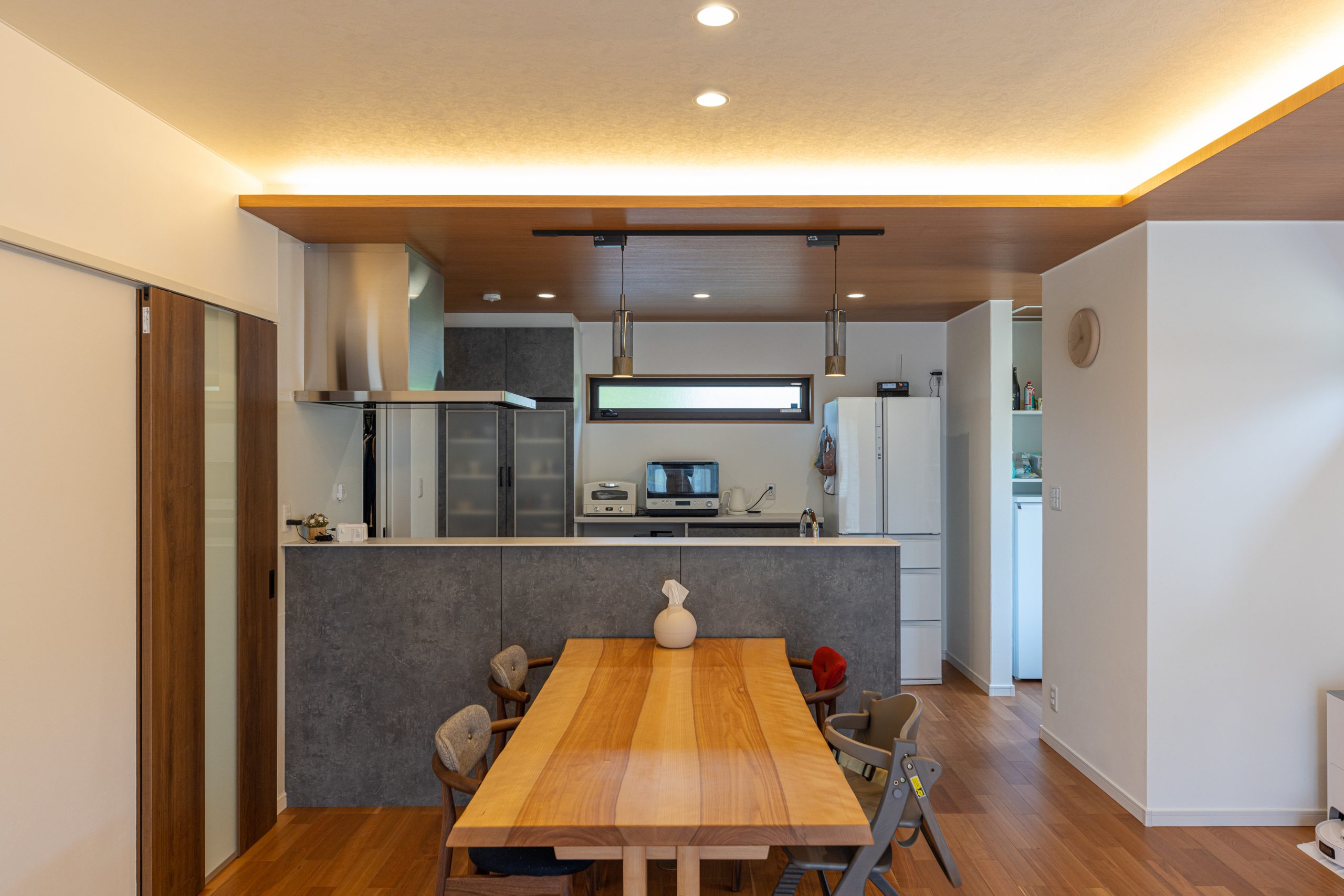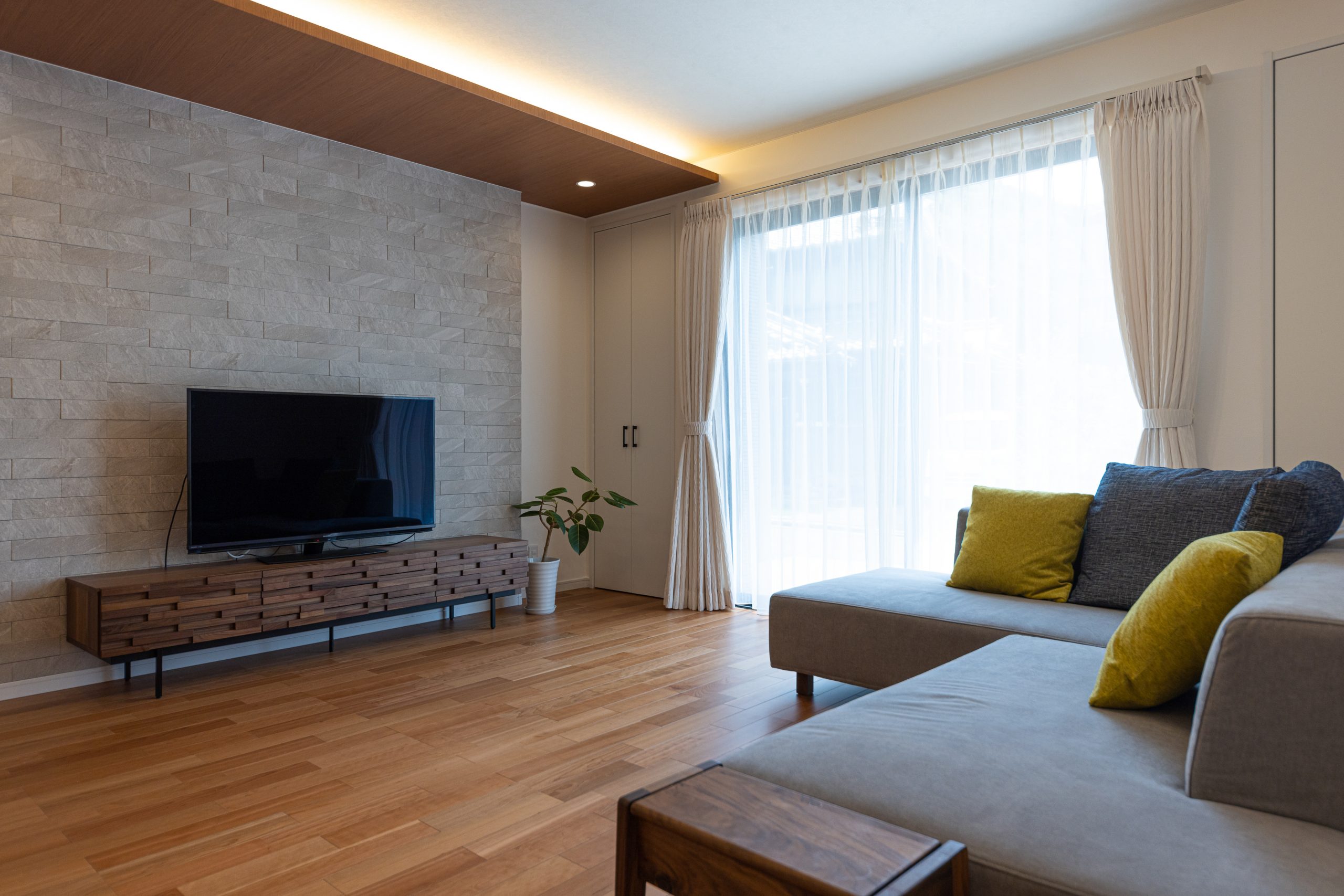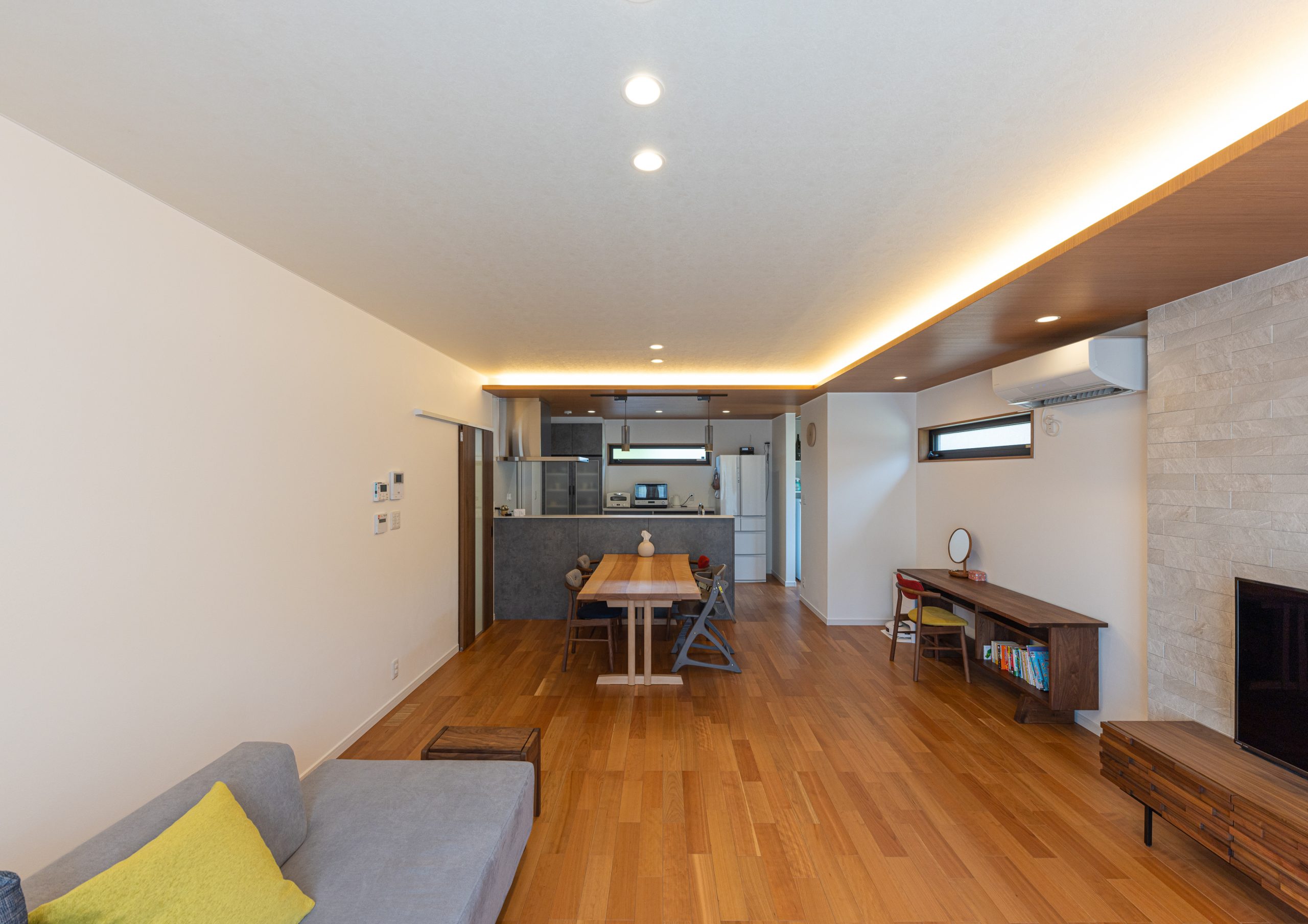 今回紹介する事例は、間接照明が彩るナチュラルモダンな2階建てです。昼間は電気をつけなくても明るい家にしたい、家事と育児が両立しやすい環境にしたいなど、さまざまなこだわりを詰め込んだ住まい。オーナー様ご夫婦に家づくりのきっかけや要望を伺うとともに、お家の特徴をご紹介します。