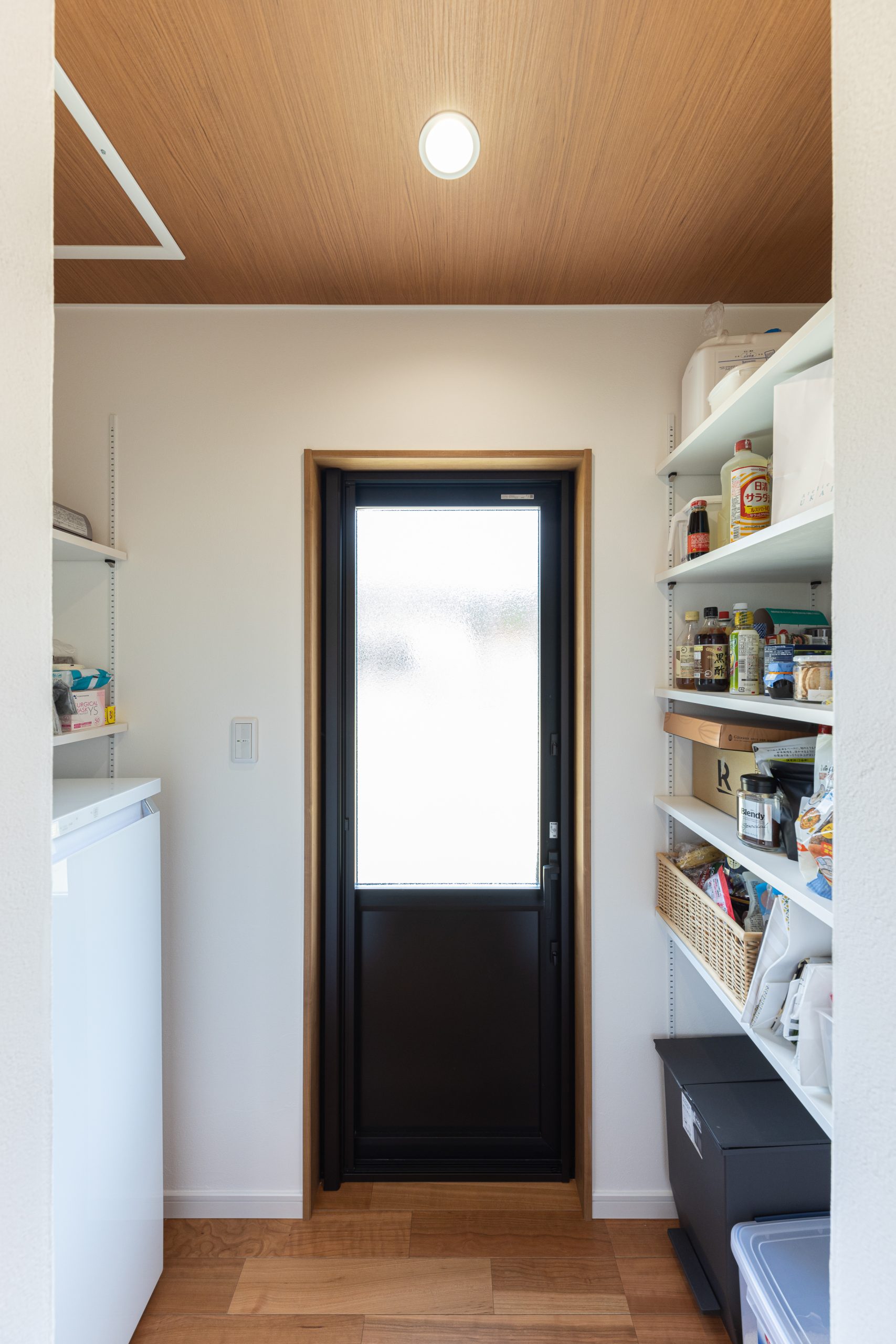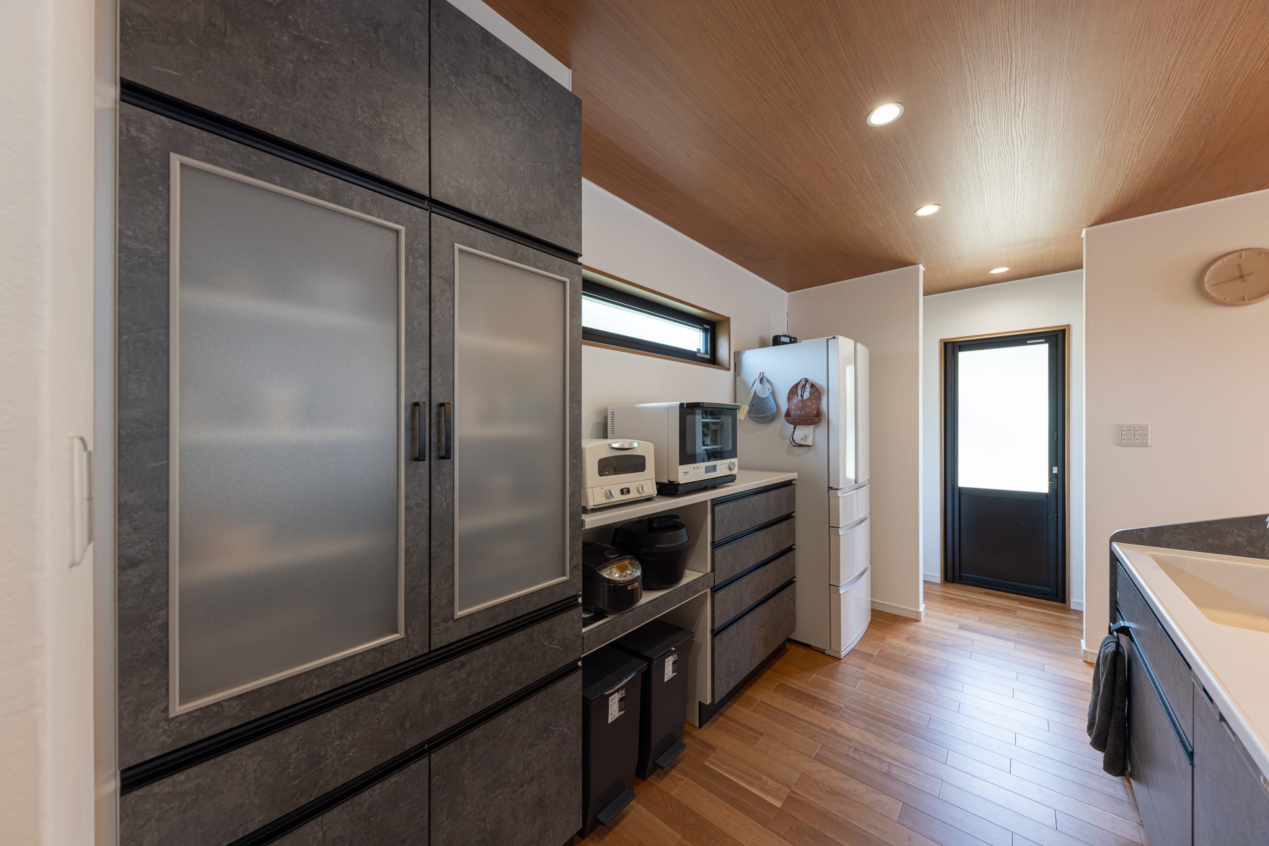 さらに、グレーで統一感があり、高窓で昼間は明るい空間になっています。キッチン横に奥行きのあるパントリーも設置しているので、ストックもたくさん置くことができます。